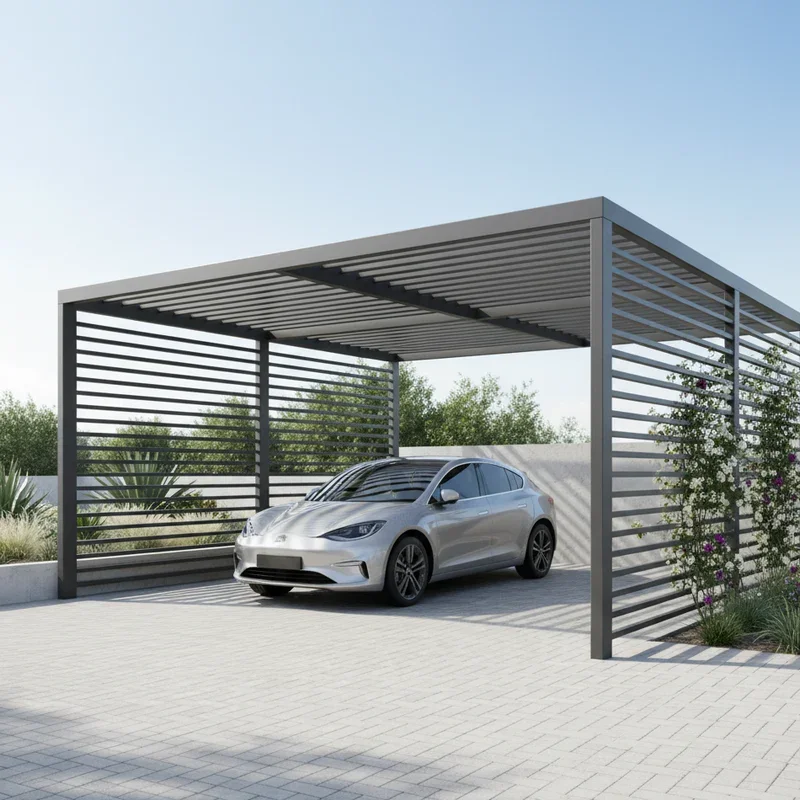 Pergola-style metal carports blend the airy openness of traditional pergolas with the durability and low maintenance of steel construction. These hybrid structures feature open beam frameworks with slatted or partial roofing that provides filtered shade and rain protection. The partial coverage reduces wind resistance while still offering substantial weather protection for vehicles underneath. Metal construction eliminates the rot, insect damage, and frequent maintenance wooden pergolas require. The open design creates covered outdoor living spaces that extend beyond pure vehicle protection. Add climbing plants or hanging baskets to soften the metal framework and integrate the structure with surrounding gardens. These carports suit temperate climates where complete weather protection isn't essential. The lighter visual weight appeals to homeowners wanting coverage without solid, enclosed feelings. Powder-coated finishes provide color options that coordinate with outdoor living spaces. The contemporary interpretation of classic pergola design creates unique, attractive solutions.