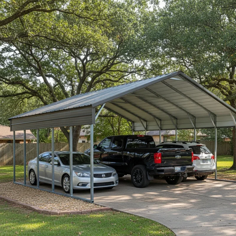 Double-wide metal carports accommodate multiple vehicles side-by-side, protecting entire family fleets or creating covered workspace alongside parking areas. These expansive structures typically span 18 to 24 feet wide, comfortably sheltering two vehicles with room between for door opening. The generous coverage creates versatile outdoor spaces useful for gatherings, workspace, or equipment storage beyond just vehicle protection. Metal construction allows for wide spans without requiring interior support posts that would obstruct parking. You'll appreciate the flexibility these larger footprints provide for changing needs over time. Perhaps you start with two cars but later convert half the space to workshop area. The substantial roof protects valuable assets while creating impressive covered areas that enhance property functionality. Matching your home's style through color selection and roof design ensures these larger structures complement rather than overwhelm your property aesthetics.