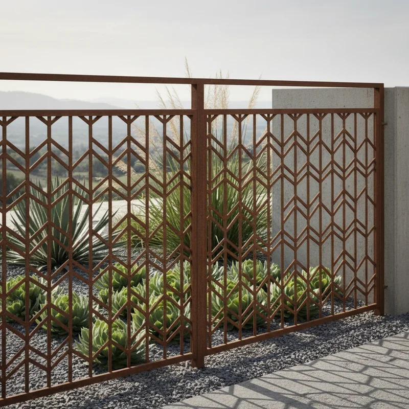 Corten steel develops beautiful rust-colored patinas that actually protect the metal underneath, creating living artwork that evolves over time. This self-protecting oxidation process eliminates painting requirements while delivering stunning orange-brown surfaces full of character and depth. The industrial-meets-natural aesthetic works phenomenally well in modern rustic, contemporary, or minimalist landscapes seeking organic focal points. These panels typically come in large formats, creating bold statements with minimal visual interruption from posts or supports. The weathering process takes several months, gradually transitioning from raw steel to rich, earthy tones. Pair corten steel with native grasses, succulents, or drought-tolerant plants for cohesive, low-maintenance landscape designs. You'll love how these fences become more beautiful with age rather than deteriorating like traditional materials!
