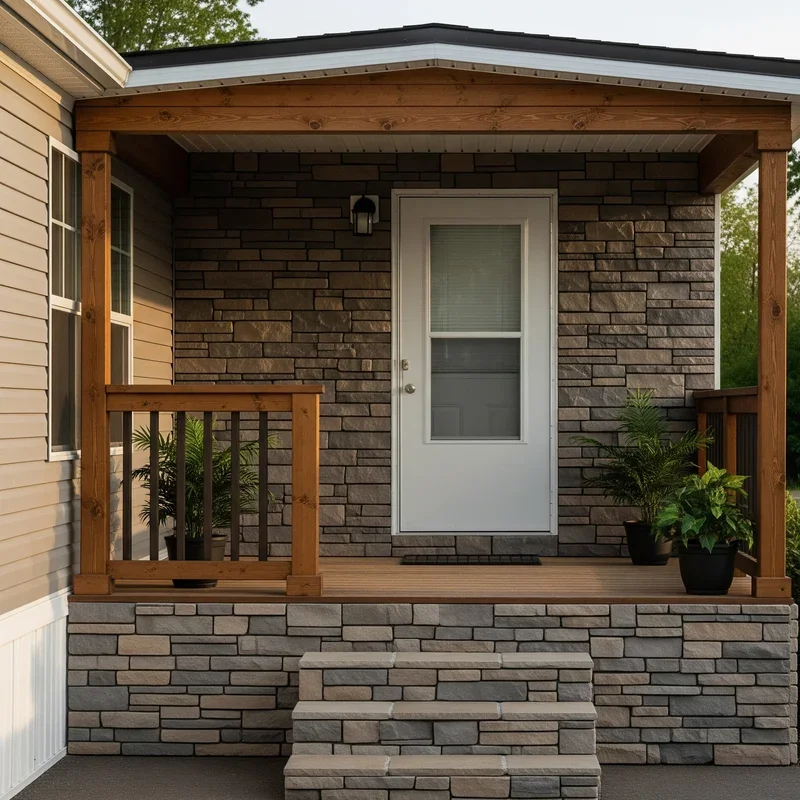 Transform your mobile home's entrance into a luxurious retreat by incorporating stone veneer elements that create an upscale appearance without the hefty price tag of real stone. These lightweight panels install easily over existing structures while providing that coveted natural texture everyone admires. Choose from stacked stone for a contemporary look or river rock for rustic appeal, then watch your home's perceived value skyrocket. The stone base grounds your porch visually while making your mobile home appear more permanent and substantial. Combine stone columns with wooden railings for a perfect blend of materials that feels both elegant and welcoming. Add uplighting to highlight the stone's texture at night, creating dramatic shadows that make your entrance absolutely stunning. This upgrade works especially well for mobile homes in upscale communities where you want to match the neighborhood's aesthetic.