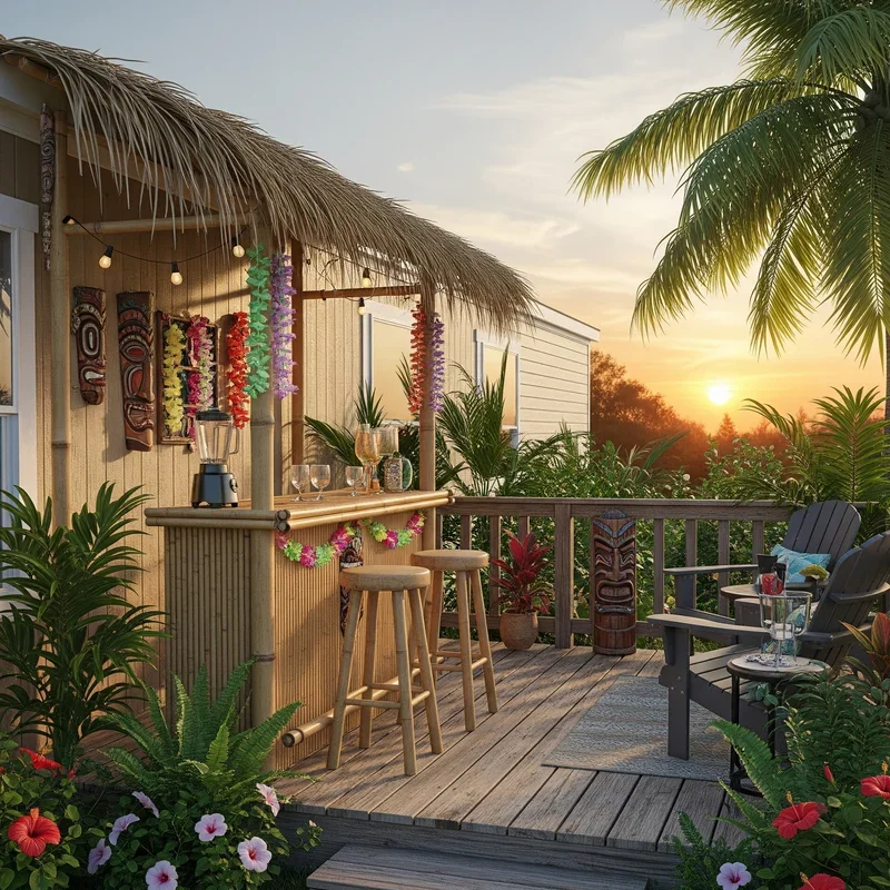 Why travel to Hawaii when you can create your own tropical paradise right outside your mobile home door? Transform your porch into a tiki-inspired oasis complete with bamboo accents, thatched roof elements, and colorful string lights shaped like pineapples or flamingos. Install a compact outdoor bar with bamboo facing where you can mix fruity cocktails for friends while Jimmy Buffett tunes set the mood. Surround the space with potted palms, bird of paradise plants, and hibiscus flowers that transport everyone to island time instantly. Grass skirts around table edges and tiki torches (the safe, solar-powered kind) complete the themed environment. This playful approach works especially well in warm climates or for anyone who wants their daily life to feel more like a permanent vacation. Your mobile home becomes the neighborhood's favorite happy hour destination.