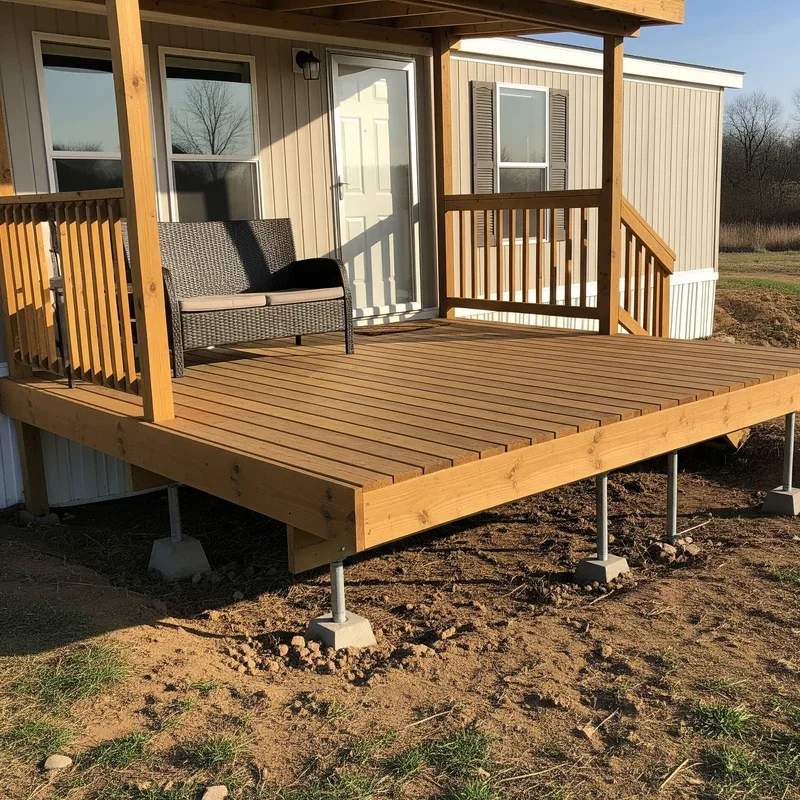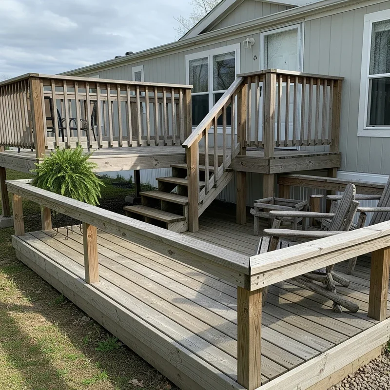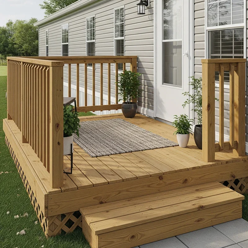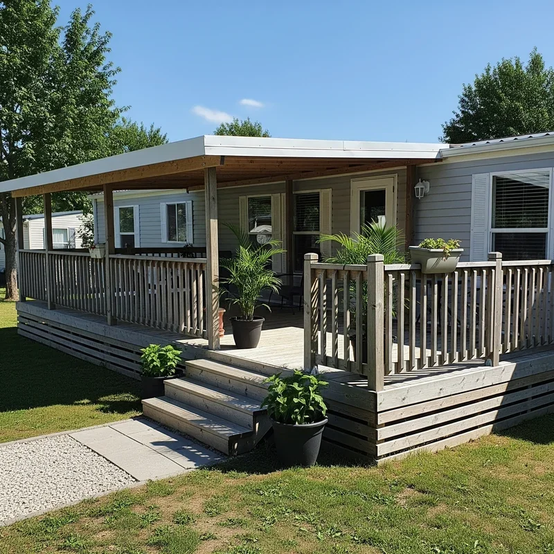 Nothing beats the timeless appeal of a traditional wooden deck that extends your living space into the great outdoors. Picture yourself stepping onto warm cedar planks that release their distinctive aroma with each footfall. Wood offers incredible versatility, allowing you to stain it in rich mahogany tones or keep it natural for that authentic cabin vibe. The best part? You can customize the size to fit your mobile home's dimensions perfectly, whether you want a cozy 8x10 footer or an expansive entertainment zone. Add built-in benches along the perimeter, and you've created instant seating without cluttering the space with furniture. With proper sealing and regular maintenance, your wooden deck will age gracefully, developing that coveted weathered patina that makes every gathering feel like a rustic retreat.
