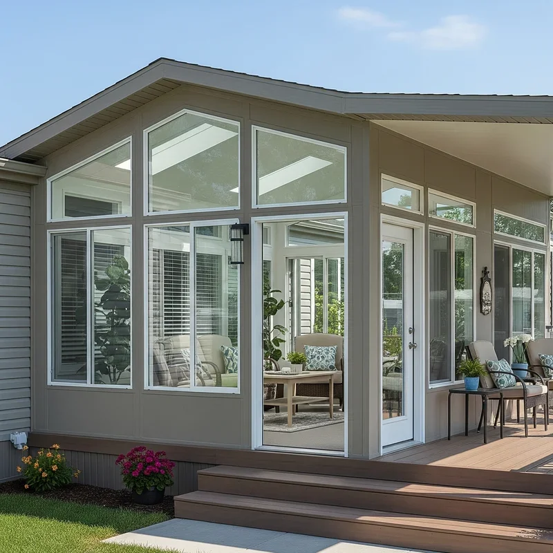 Extend your living space year-round with a four-season sunroom that essentially adds another room to your mobile home while maintaining that outdoor connection you crave. These engineered additions feature insulated glass panels and climate control options that keep you comfortable whether it's snowing or sweltering outside. Use this bright, airy space as a home office, yoga studio, or plant sanctuary where your green thumb can thrive regardless of weather conditions. The abundance of natural light reduces your reliance on artificial lighting during daytime hours, potentially lowering energy bills. Choose window styles that complement your mobile home's architecture, from contemporary floor-to-ceiling panels to traditional divided light designs. Many sunroom kits are specifically designed for mobile home installation, ensuring proper weight distribution and attachment. This investment significantly increases both living space and property value.