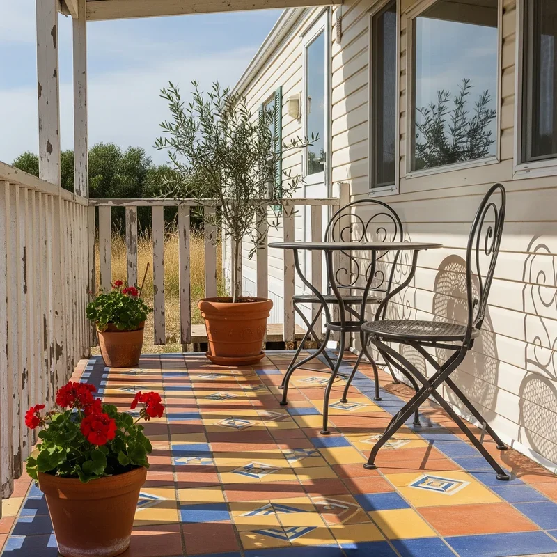 Transport yourself to the sun-drenched coasts of Spain or Italy with a tile porch that brings Mediterranean elegance to your mobile home entrance. Choose terracotta tiles for authentic warmth or decorative cement tiles featuring intricate patterns that create an artistic floor beneath your feet. The tile's thermal mass keeps the surface cool during hot days while radiating stored heat during cooler evenings, naturally regulating temperature for comfort. Incorporate wrought iron railings with curved details and climbing jasmine or bougainvillea for that quintessential Mediterranean romance. Add a small fountain or water feature whose gentle bubbling creates soothing ambiance while masking any nearby traffic noise. Large ceramic pots filled with olive trees, lavender, or rosemary complete the sensory experience with colors and fragrances that transport you straight to the Riviera.