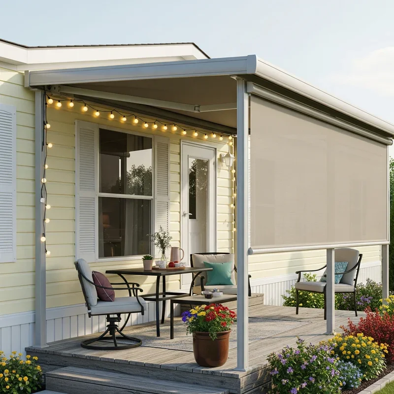 Weather unpredictability doesn't have to dictate your outdoor enjoyment when you install a covered patio featuring a retractable awning system. This smart solution lets you control exactly how much sun or shade you want at any given moment. During gentle spring days, retract the awning completely to soak up vitamin D, then extend it fully when summer heat becomes overwhelming. Modern awning materials come in gorgeous patterns and colors that complement your mobile home's exterior while providing UV protection and water resistance. Add outdoor ceiling fans beneath the covered area for enhanced comfort during humid months. The structure itself can support hanging plants, speakers, or even a flat-screen TV for the ultimate outdoor entertainment zone. This flexibility means your porch remains functional whether it's drizzling, blazing hot, or perfectly pleasant outside.