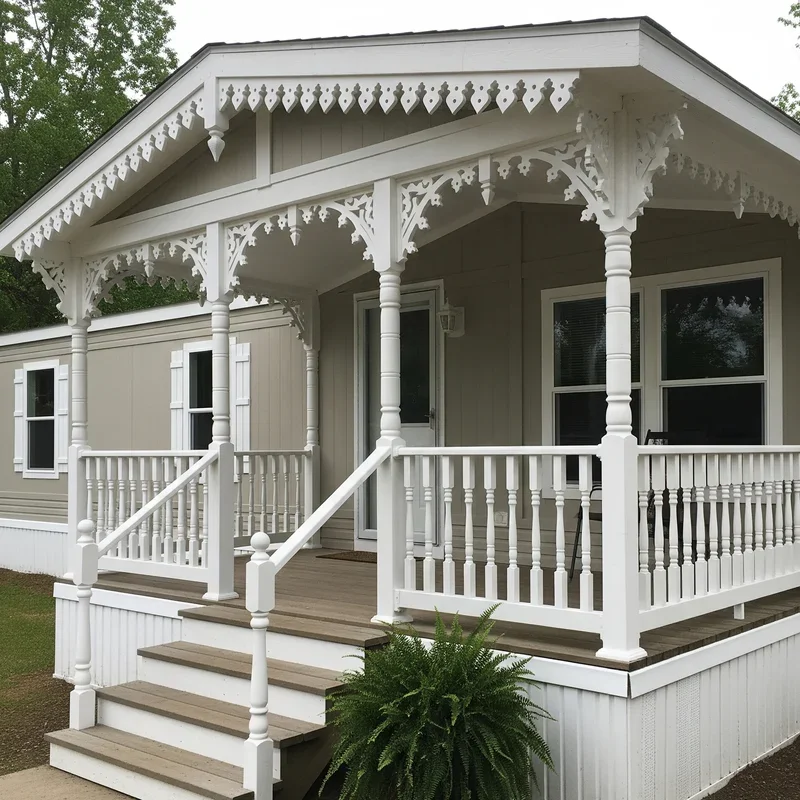Transport your mobile home back to the elegance of the Victorian era with decorative brackets, spindle work, and gingerbread trim that creates visual feast for the eyes. This ornate style proves that mobile homes can embrace historical architectural elements just as beautifully as any century-old mansion. Install turned balusters and posts with intricate carved details, then crown everything with decorative corbels that draw the eye upward. Paint everything in period-appropriate colors like deep burgundy with cream trim or sage green with white accents for authentic Victorian charm. Add a few hanging ferns in ornate planters and perhaps a stained glass panel near the door to complete the transformation. The elaborate details create such visual interest that visitors often forget they're looking at a mobile home. This style particularly suits older mobile homes where the vintage aesthetic feels natural.