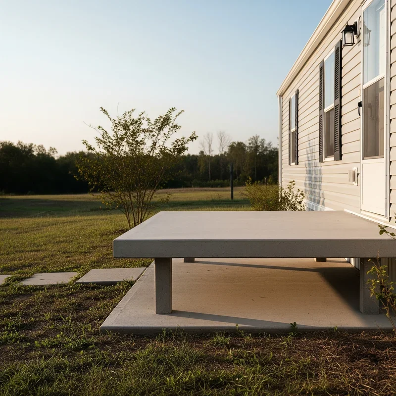 Sometimes less really is more, especially when you're going for that sleek, contemporary vibe that makes your mobile home look like it belongs in an architectural magazine. A polished concrete porch offers clean lines and industrial chic appeal while requiring virtually zero maintenance compared to wood options. The smooth surface provides the perfect canvas for modern outdoor furniture with geometric shapes and bold colors. Add a few large concrete planters with architectural succulents or ornamental grasses for texture without cluttering the minimalist aesthetic. LED strip lighting embedded along the edges creates a futuristic glow at night. The beauty of concrete lies in its versatility; you can stamp patterns, add color, or keep it raw for that authentic industrial look. Weather-resistant and incredibly durable, this option proves that mobile home porches can be both practical and cutting-edge stylish.
