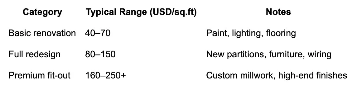 Add a 10–15% contingency for unexpected structural or compliance costs. Discuss phasing with your contractor to reduce downtime. Large firms often renovate in sections so operations continue while construction happens elsewhere.