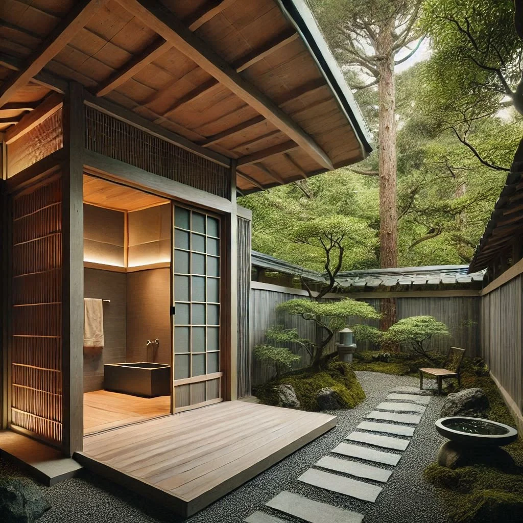 Inspired by the tranquility of Japanese onsen spas, this outdoor bathroom design offers a serene escape into nature. A wooden soaking tub, or ofuro, serves as the centerpiece, providing a deep, warm bath that soothes both body and mind. Surround the space with natural stone elements, creating an organic flow that blends effortlessly with the outdoors. A bamboo privacy fence enhances the feeling of seclusion while maintaining an authentic, Zen-inspired aesthetic. A gravel pathway lined with smooth river stones and lantern lighting leads to the tub, reinforcing the meditative ambiance. Soft flowing water, lush greenery, and minimalist décor complete the peaceful setting, allowing you to unwind in pure Japanese-inspired luxury, where every soak becomes a ritual of relaxation and renewal.