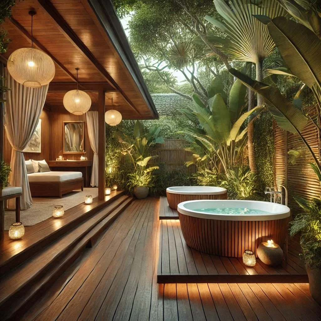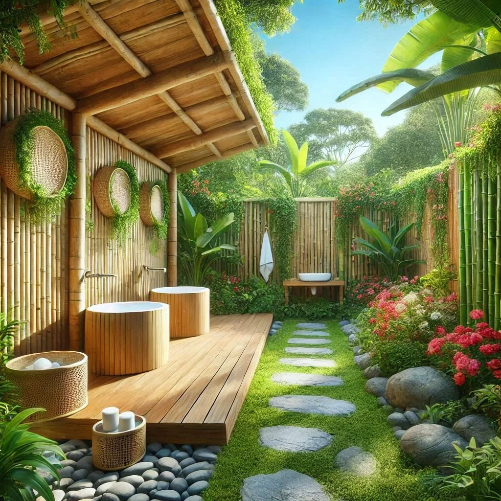 Use bamboo screens, wooden partitions, outdoor curtains, or lush greenery to create a private and intimate bathing space.