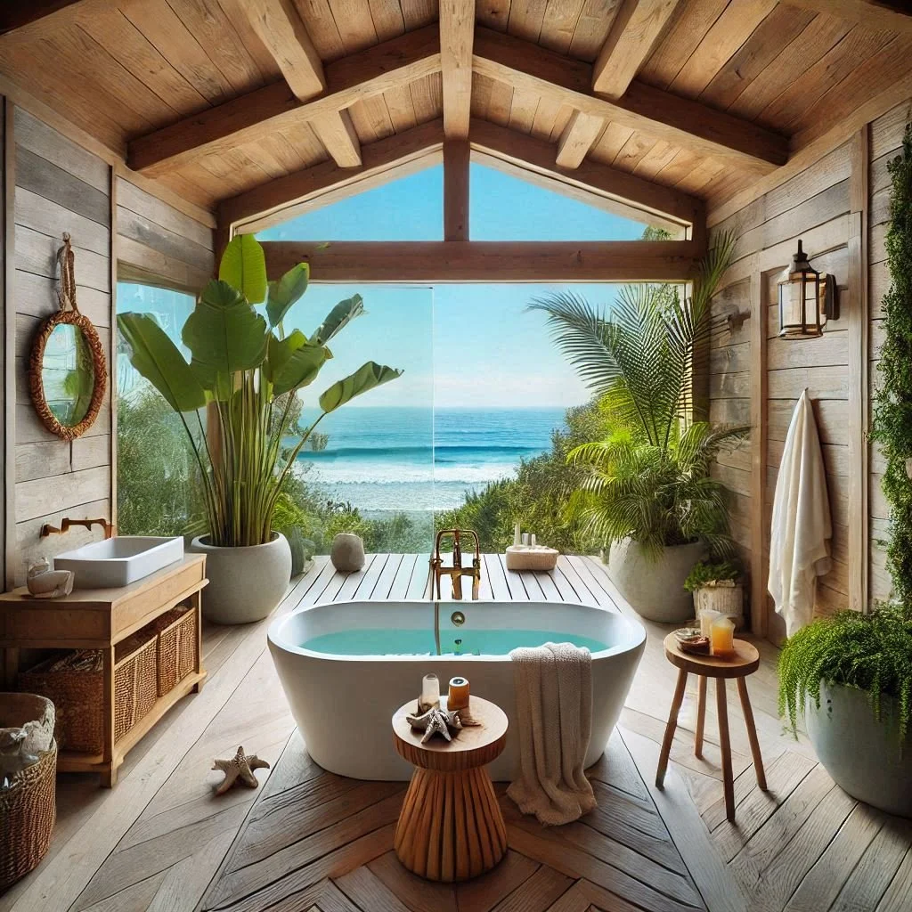 Bring the ultimate resort experience to your backyard with a cabana-style outdoor bathroom, evoking the luxurious feel of a beachside retreat. Imagine stepping into a breezy oasis, where light, flowing curtains sway gently with the wind, creating an elegant sense of privacy. A teak vanity and lounge chair add warmth and sophistication, while plush, oversized towels enhance the spa-like ambiance. Install a rainfall showerhead for an indulgent bathing experience, complemented by woven lanterns and soft lighting to set a tranquil mood. A natural stone floor and surrounding palm trees complete the tropical aesthetic, making every rinse feel like a getaway. This cabana-inspired escape transforms outdoor bathing into a stylish, serene, and rejuvenating experience—right at home.