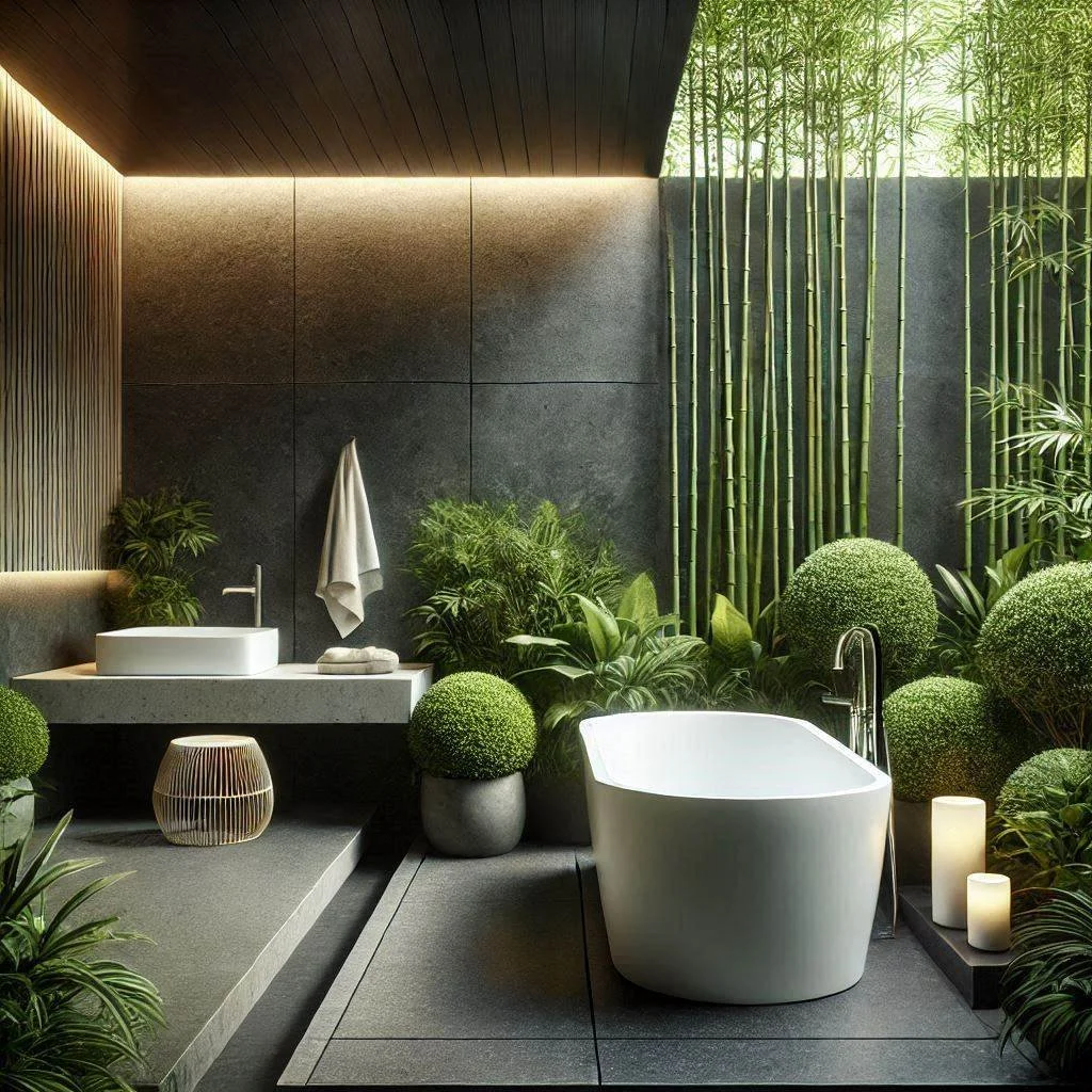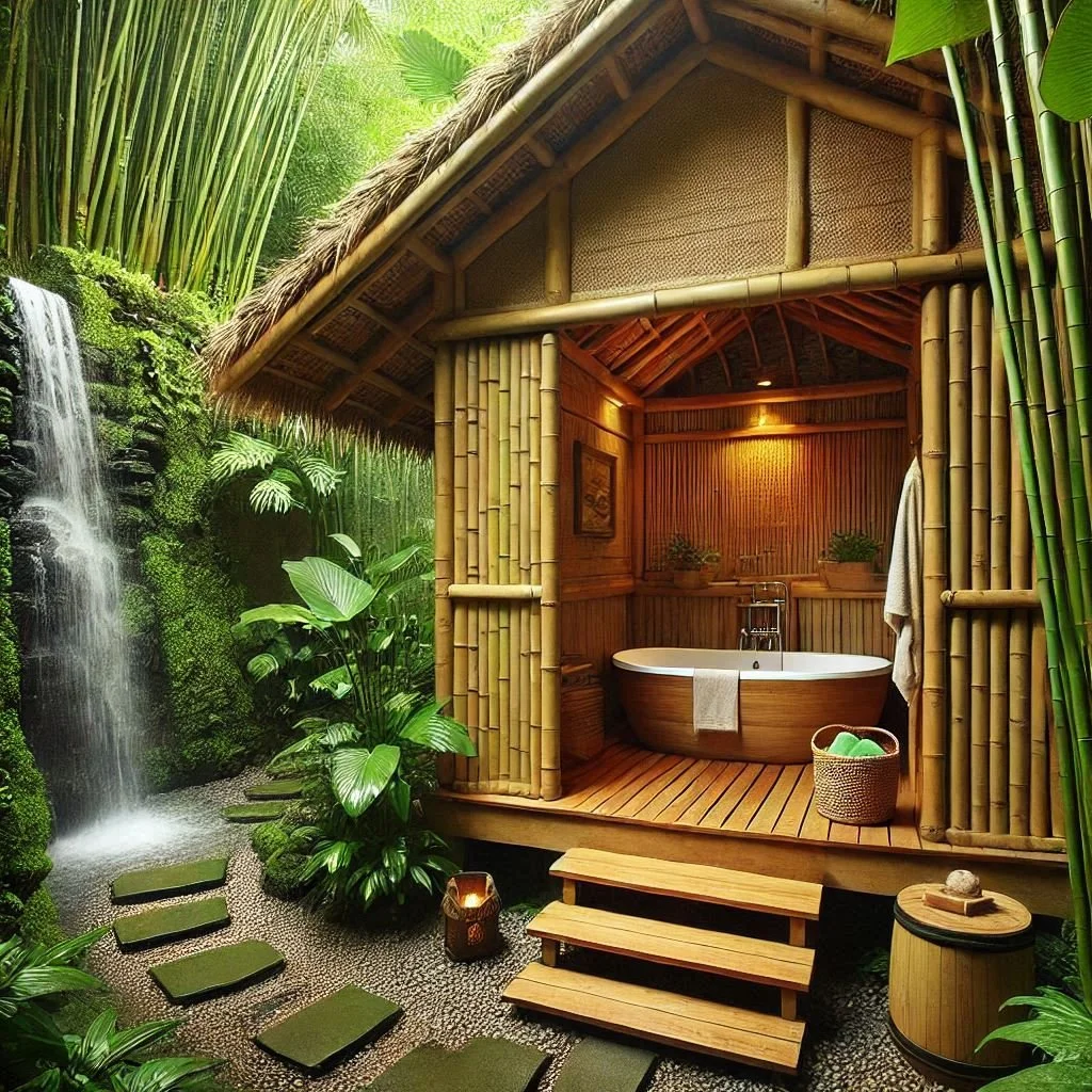For a truly zen-inspired outdoor bathroom, embrace the tranquility of bamboo by using it as privacy walls, creating a secluded retreat that blends seamlessly with nature. Bamboo’s sustainable and durable qualities make it an eco-friendly choice, offering both beauty and functionality. Pair this with a stone basin sink, which adds a raw, organic touch while maintaining an elegant, spa-like feel. Bamboo flooring not only complements the aesthetic but also ensures a natural, slip-resistant surface, perfect for an outdoor setting. Enhance the ambiance with soft lantern lighting, smooth river stones, and cascading greenery for a peaceful atmosphere. Whether you’re indulging in a morning shower or unwinding in the evening, this bamboo sanctuary delivers a soothing, mindful bathing experience.