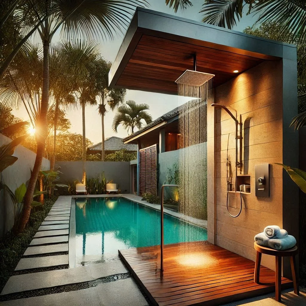 A poolside outdoor shower is the perfect combination of style and practicality, offering a refreshing rinse before or after a swim. A sleek stainless-steel fixture, mounted on a stone or wooden panel, provides both durability and modern elegance, ensuring it withstands outdoor conditions while maintaining a polished look. Enhance functionality by adding a foot-rinsing station, making it easy to wash off sand or chlorine before stepping indoors. To elevate the design, incorporate pebble flooring for a natural, slip-resistant surface and surround the space with tropical plants or bamboo screens for added privacy. Whether rinsing off after a dip or cooling down on a hot day, this chic, minimalist setup turns an everyday necessity into an effortlessly stylish outdoor feature.