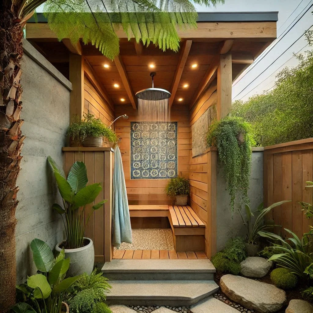 For those who love sleek, contemporary aesthetics, a modern outdoor bathroom offers the perfect blend of minimalism and sophistication. Picture smooth concrete walls, providing an industrial-chic backdrop that feels effortlessly stylish. Matte black fixtures contrast beautifully against the neutral tones, adding a touch of modern elegance. A frameless glass shower keeps the space open and airy, allowing you to fully immerse in the surrounding outdoor beauty. To elevate the look, incorporate geometric tiles in subtle patterns, adding just the right amount of visual interest without overwhelming the minimalist vibe. Stick to a neutral color palette, with shades of gray, white, and soft beige, ensuring a clean, refined aesthetic. This understated yet luxurious setup transforms an ordinary shower into an outdoor design statement.