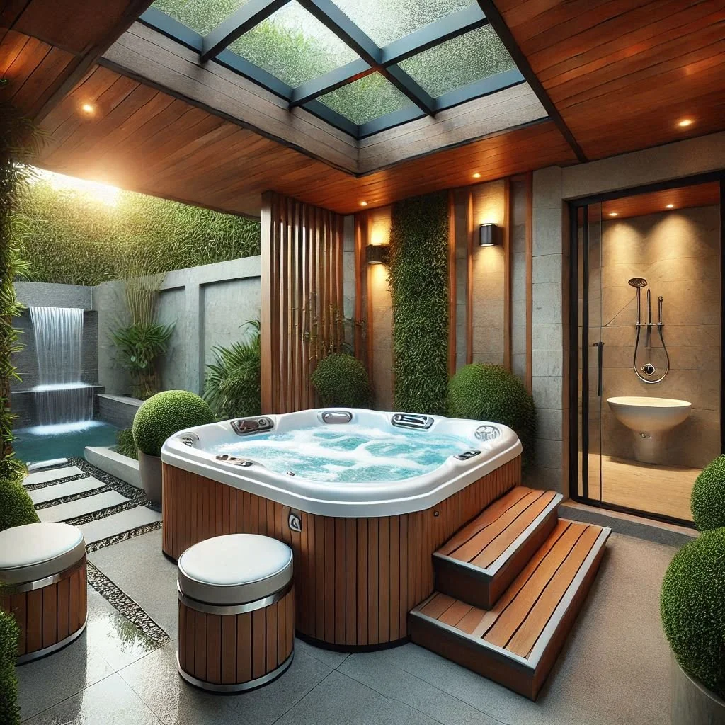 Blend relaxation and practicality with a hot tub and integrated shower, creating the ultimate outdoor retreat. Soak in the warm, bubbling waters of a luxurious hot tub, letting the stress of the day melt away under the open sky. When you're ready, step under the built-in shower, offering a refreshing rinse to cool off or cleanse before and after your soak. Opt for natural wood decking to add warmth and ensure proper drainage, while stone accents and lush greenery enhance the spa-like feel. For an added touch of ambiance, install soft LED lighting around the space to create a serene evening atmosphere. This multifunctional setup seamlessly combines comfort and convenience, transforming your backyard into a private wellness oasis.