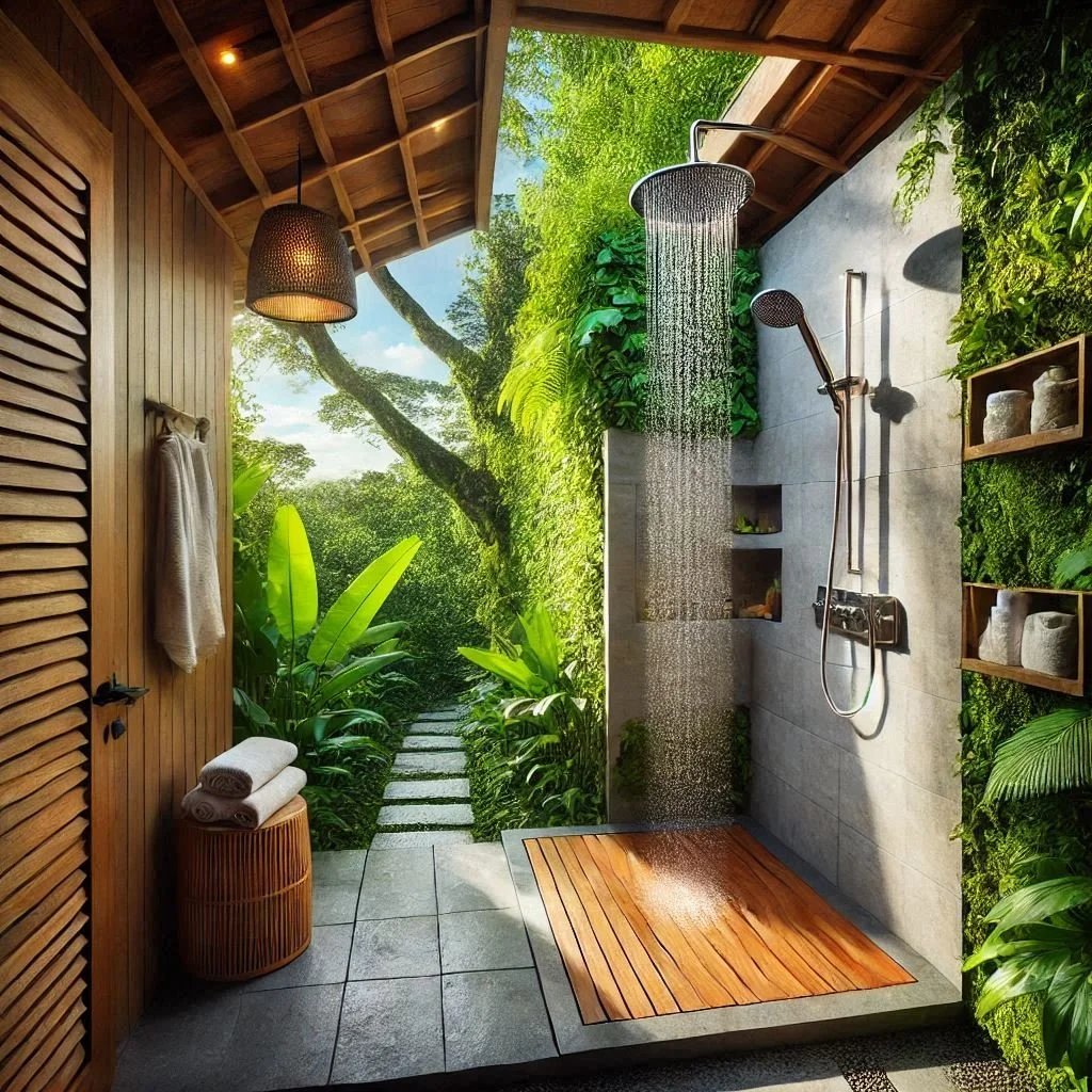 There's nothing quite like the invigorating experience of a rain shower in the great outdoors, where the soothing sound of cascading water blends with the natural surroundings. Installing a rainfall showerhead overhead instantly transforms your space into a luxurious retreat, offering a spa-like ambiance right in your backyard. Surround the area with natural stone, wooden decking, or textured tiles to enhance the organic feel while ensuring durability. Adding lush tropical plants like ferns, palms, and bamboo creates a serene oasis, making every shower a refreshing escape. For functionality, incorporate a wooden slatted floor that allows proper drainage while maintaining a sleek, modern look. Whether morning or evening, this outdoor shower setup delivers an unmatched sense of relaxation and indulgence in nature.