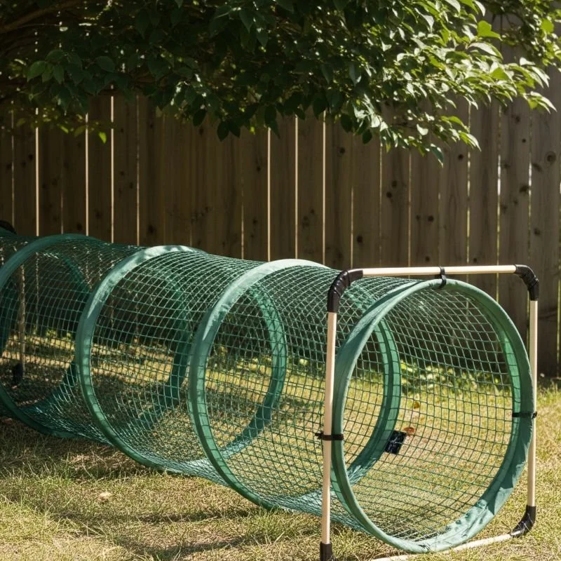 Channel your inner engineer with DIY PVC pipe tunnels that customize perfectly to your space while keeping costs down. Standard PVC pipes and connectors create sturdy frames that support mesh or wire covering. The modular nature means easy modifications as needs change. Design straight runs, curves, or complex mazes using elbow joints and T-connectors. Cover frames with pet-safe mesh attached using zip ties or clips. Total materials cost $50-200 depending on tunnel length and complexity. PVC's weather resistance ensures longevity while the lightweight construction allows seasonal repositioning. Paint pipes to match your landscape or leave white for visibility. Include inspection hatches using removable sections for easy cat retrieval. This DIY approach lets you navigate around obstacles like trees or garden features. Online tutorials provide step-by-step instructions for various configurations, making this accessible to novice builders.