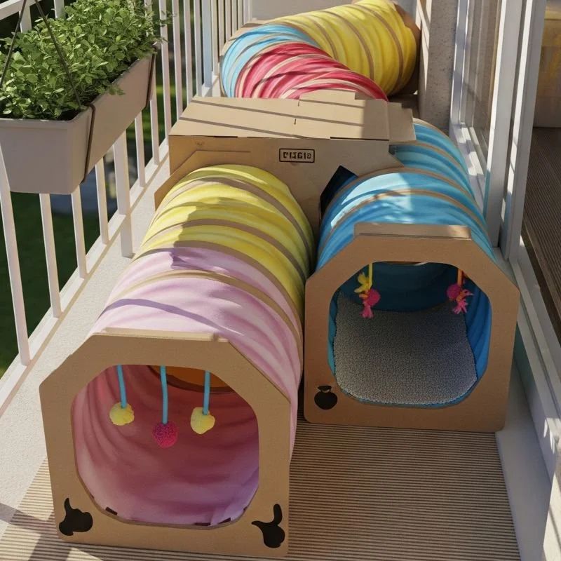 Transform boring balconies into feline paradises with specialized tunnel systems designed for high-rise living. These tunnels maximize vertical space while ensuring absolute security against falls. Start with sturdy frames that attach to balcony railings using clamps or brackets requiring no drilling. Extend mesh or solid panels from floor to ceiling, creating secure zones. Include hammocks, shelves, and climbing elements within the tunnel structure. Prices vary from $200 for basic enclosures to $800 for elaborate systems. Consider wind resistance in design, using partial solid panels as windbreaks. The enclosed nature means cats enjoy fresh air and city views safely. Add artificial grass, cat-safe plants, or water features for sensory enrichment. Modular designs accommodate different balcony shapes and sizes. This solution brings nature to urban cats while maintaining building regulations and neighbor relations.