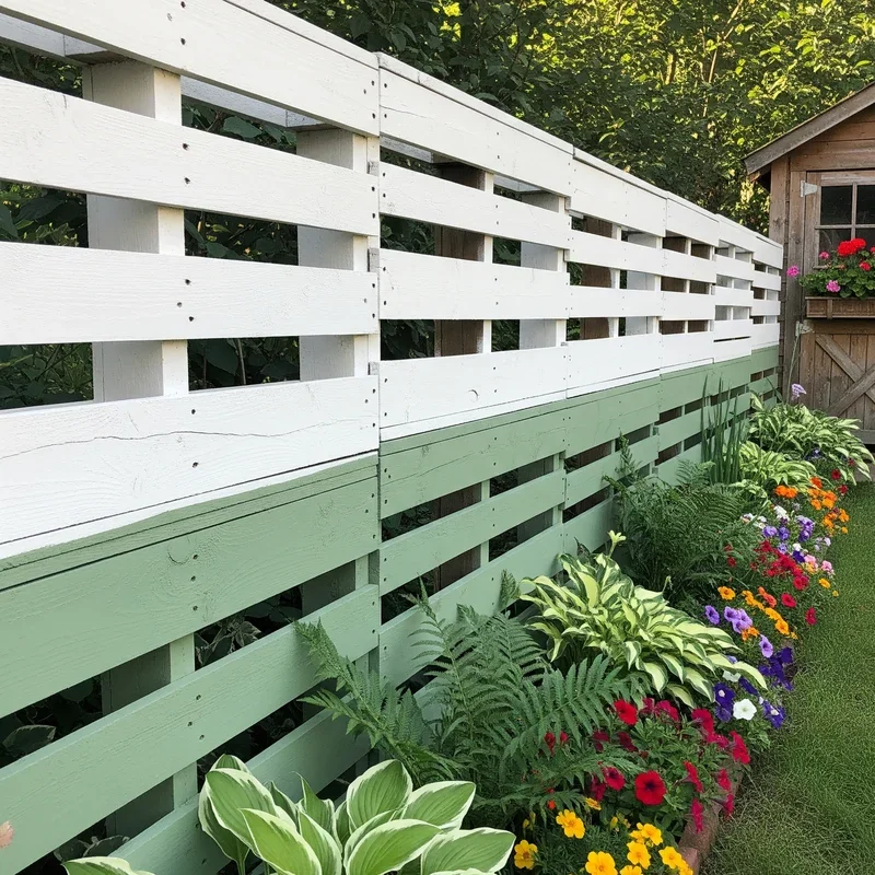 Double the impact with a two-tone painted pallet fence that adds sophisticated color blocking to your outdoor space! This design technique uses two complementary or contrasting colors to create visual interest and define different areas of your fence. You might paint the frame one color and the slats another, or alternate colors between sections for a rhythmic pattern. Popular combinations include navy and white for nautical vibes, sage green and cream for farmhouse charm, or charcoal and natural wood for modern appeal. This approach allows you to tie your fence into your home's exterior color scheme or garden palette. The two-tone treatment also helps break up long fence runs and can make your yard appear larger by creating visual segments.
