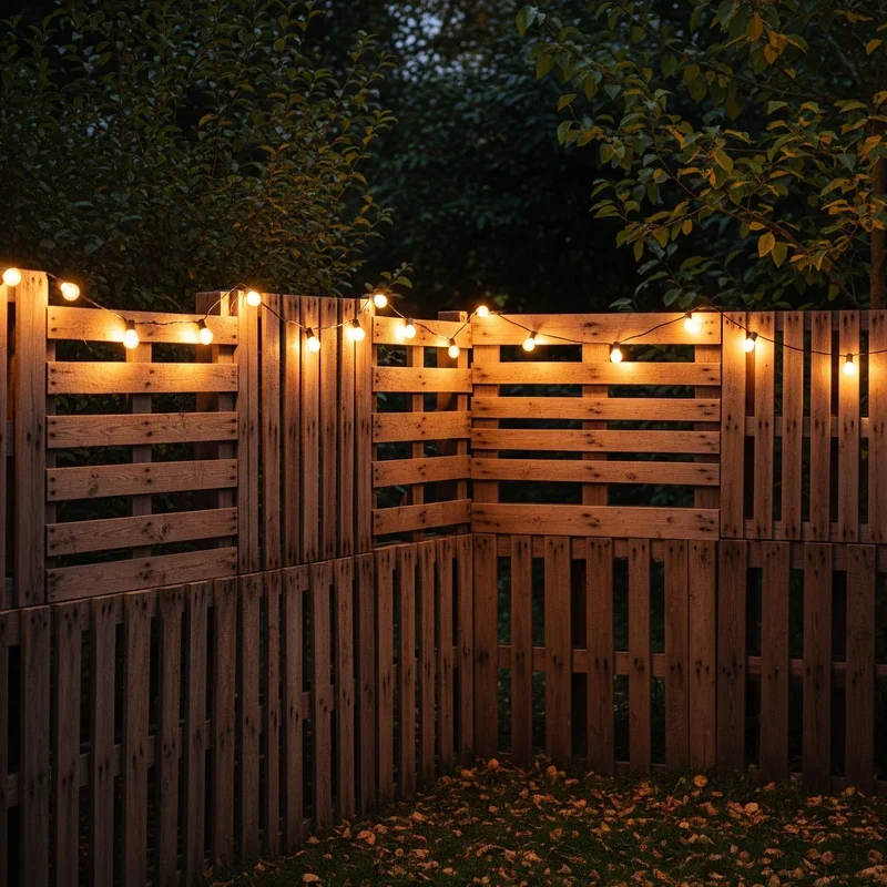 Transform your pallet fence into an enchanting evening backdrop with the magical addition of string lights! This simple upgrade turns a basic boundary into an atmospheric feature that extends your outdoor living well into the night. Weave warm white lights through the slats, drape them along the top, or create patterns that highlight your fence's unique design. The soft glow creates an intimate ambiance perfect for dinner parties, romantic evenings, or late-night conversations with friends. Solar-powered options make this enhancement eco-friendly and installation-free from electrical work. The lights also serve a practical purpose, illuminating pathways and defining spaces after dark. Choose weatherproof LED strings for longevity and consider adding a dimmer for versatility.