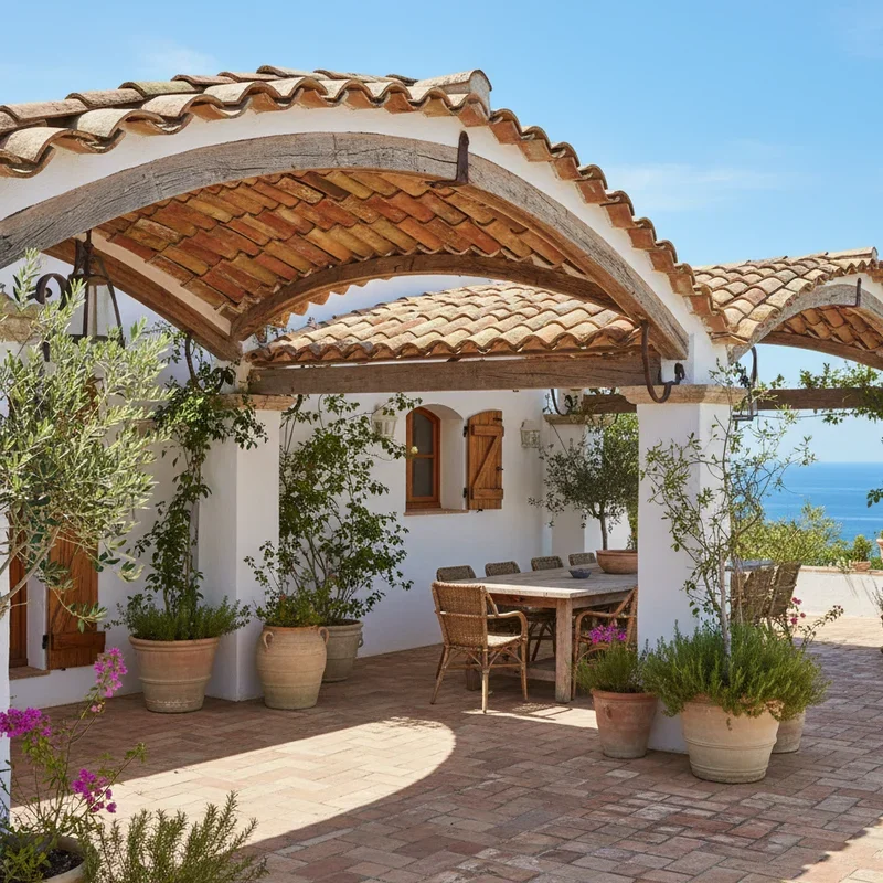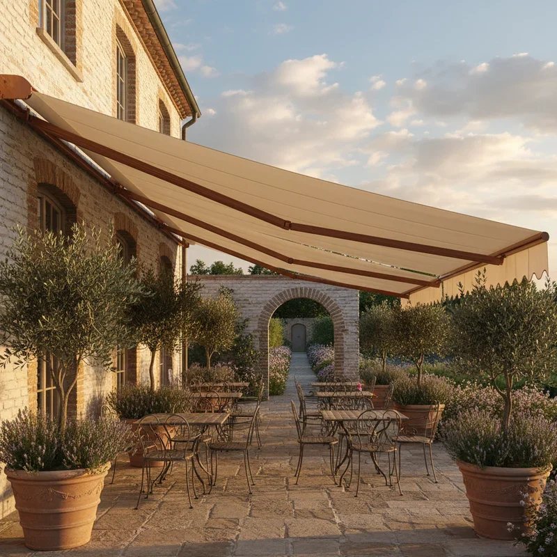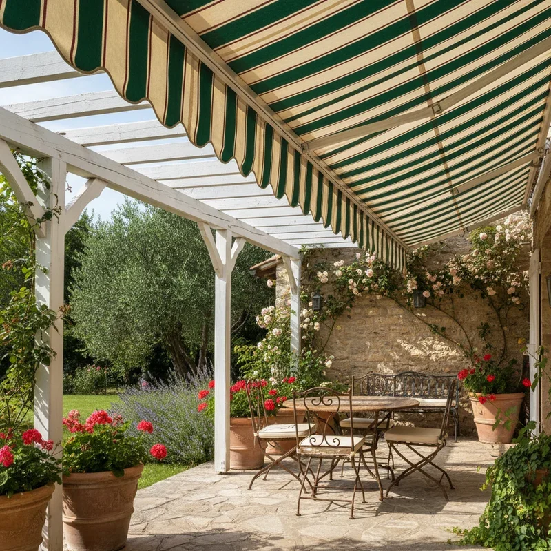 Channel the warmth of Tuscany with Mediterranean terracotta tile awnings that blend Old World charm with practical shade. These permanent structures use clay tiles over wooden or metal frameworks, creating authentic European appeal. The natural thermal mass of terracotta helps regulate temperature, keeping patios cooler than lighter materials. The distinctive orange-red hues complement stucco, stone, or brick exteriors beautifully. Barrel tiles create elegant curved profiles, while flat tiles offer cleaner lines for transitional styles. Proper installation includes waterproof underlayment and adequate structural support for the tile weight. These awnings age gracefully, developing attractive patina and moss in humid climates. The permanent nature makes them ideal for dedicated outdoor living spaces or kitchen areas. Incorporating climbing vines or hanging plants enhances the Mediterranean atmosphere. While installation costs run higher, the longevity and timeless appeal justify the investment.