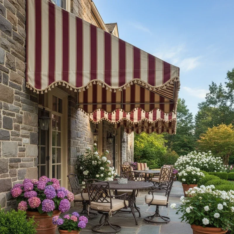 Step back in time with Victorian-style scalloped awnings that add romantic charm to any patio. These ornate shade solutions feature decorative edges, intricate valances, and often incorporate fringe or tassels. The curved shapes soften architectural lines while creating an inviting, cottage-like atmosphere. Modern materials ensure these vintage-inspired designs withstand weather without sacrificing authentic appearance. Rich colors like burgundy, forest green, or navy blue enhance the period aesthetic. Many designs include contrasting trim or piping that highlights the scalloped edges beautifully. The generous projection provides excellent shade while maintaining the decorative impact from street view. These awnings complement Victorian, Queen Anne, or cottage-style homes perfectly but also add unexpected whimsy to modern properties. Professional fabrication ensures precise scalloping and durable construction that maintains shape over time. Regular cleaning preserves the fabric's appearance and prevents mildew in humid climates.