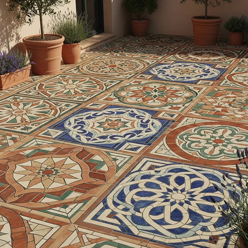 Transport yourself to a Moroccan riad or Spanish villa with intricate mosaic tile patterns that turn patios into artistic statements! These small tiles allow for incredibly detailed designs, from geometric patterns to flowing florals. Choose traditional ceramic for authentic feel or modern glass tiles for contemporary sparkle. The design possibilities are literally endless; create custom patterns or use pre-made sheets for easier installation. Mosaics work beautifully as accent borders with simpler flooring or as complete patio coverage for maximum impact. The glazed surfaces resist stains and clean easily, perfect for dining areas. Mix colors for vibrant designs or stick to blue and white for classic Mediterranean style. Your mosaic patio becomes a functional artwork that adds personality and cultural flair to outdoor living!