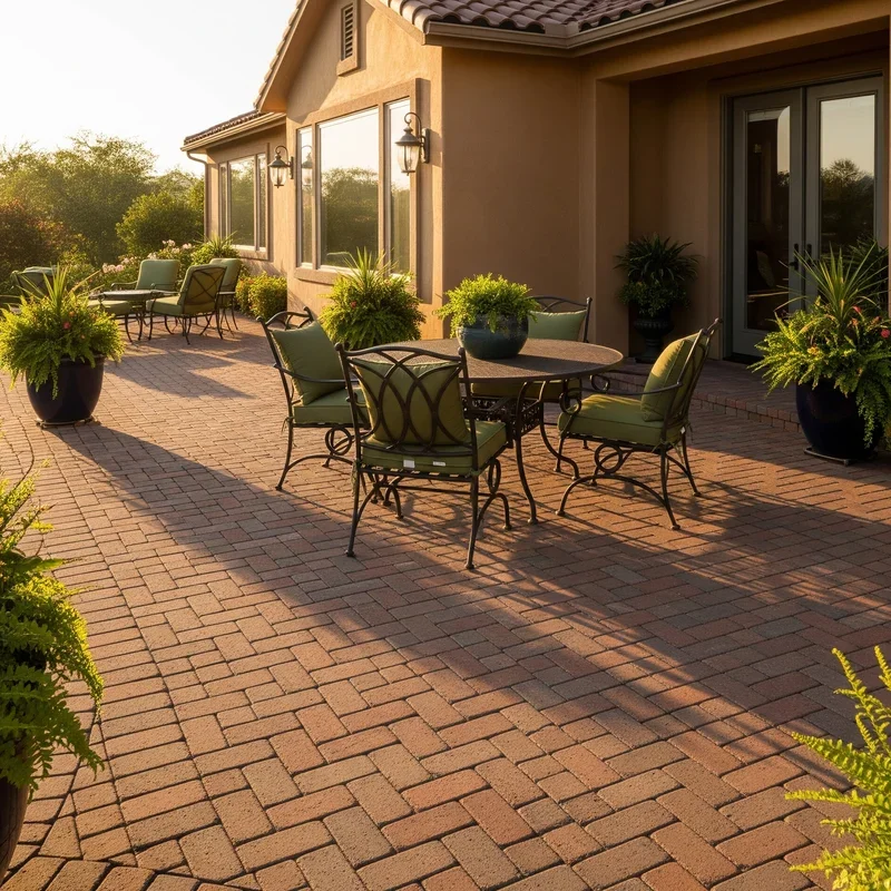 Want that charming European café feeling right in your backyard? Brick pavers deliver old-world elegance that never goes out of style! These versatile blocks come in various colors from traditional red to modern charcoal, allowing you to create patterns like herringbone, basketweave, or running bond. The textured surface provides excellent traction, making them ideal for areas that get wet. Brick pavers are incredibly durable, often lasting 25+ years with minimal maintenance. If one gets damaged, simply pop it out and replace it without redoing the entire patio. They're also eco-friendly, made from natural clay that can be recycled. The spaces between pavers allow for proper drainage, preventing puddles and ice formation. Your brick paver patio gains a patina over time that adds character, making it look better with age rather than worn out!