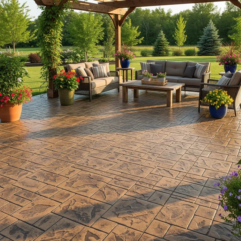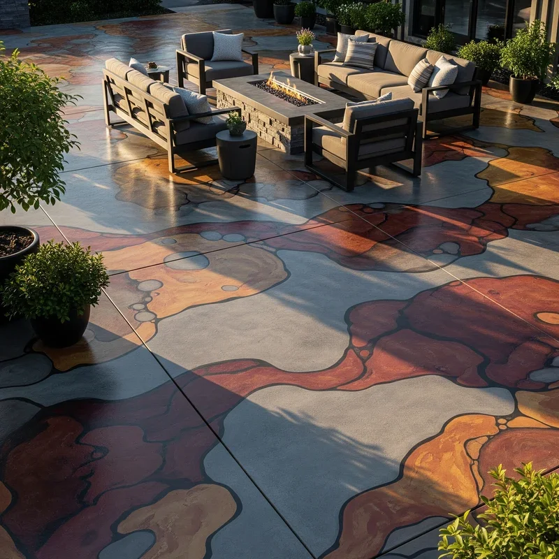 Turn that boring gray slab into a masterpiece with concrete staining that transforms ordinary into extraordinary! Acid-based or water-based stains penetrate concrete, creating rich, variegated colors that look like natural stone or marble. You can achieve single colors for subtle elegance or combine multiple hues for artistic effects. The translucent nature of stains allows concrete's natural variations to show through, ensuring unique results. Add scored patterns before staining to mimic tile or stone layouts. The color becomes part of the concrete, not just a surface coating, so it won't peel or flake. Sealed stained concrete resists stains and cleans easily with a mop. This option works great for existing patios needing a facelift without demolition. Your stained concrete patio becomes a one-of-a-kind artwork that expresses your creative vision!