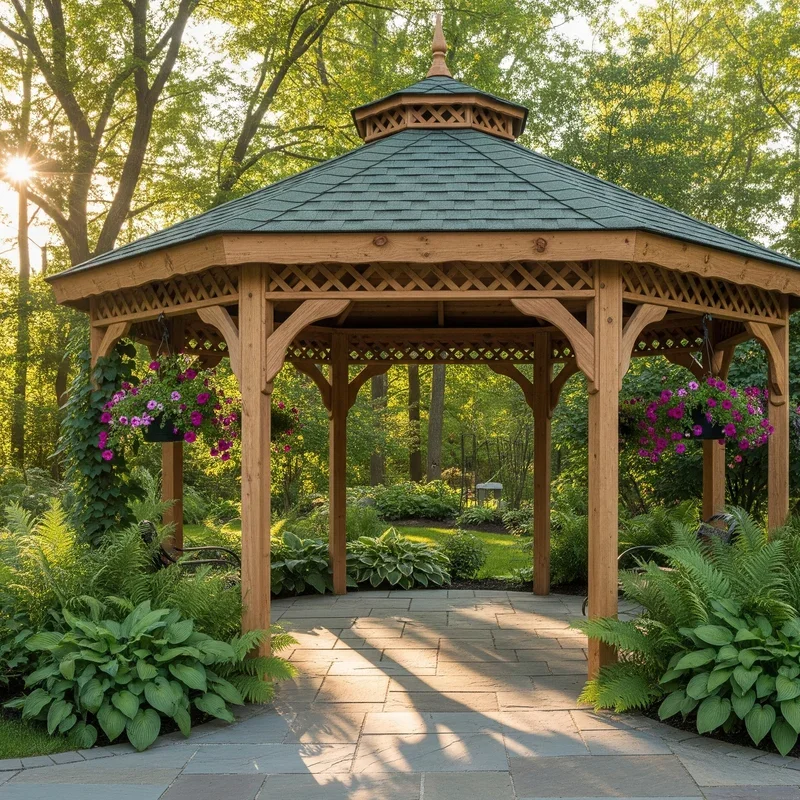 Who doesn't love the romantic charm of a classic pergola? These architectural beauties have been gracing gardens for centuries, and there's a good reason they've stuck around. Picture this: natural wood beams creating geometric shadows that dance across your patio as the sun moves through the sky. You can leave them open for that airy feel or drape climbing vines like wisteria or jasmine for natural shade and intoxicating fragrances. The best part? Pergolas work with virtually any home style, from colonial to contemporary. Whether you choose cedar for its natural weather resistance or pressure-treated pine for budget-friendliness, you're investing in a structure that adds instant curb appeal and creates that perfect outdoor room feeling everyone craves.