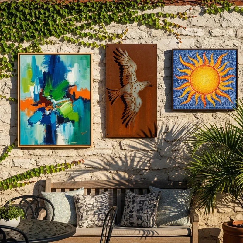 11. Outdoor Gallery Walls with Weather-Resistant Art