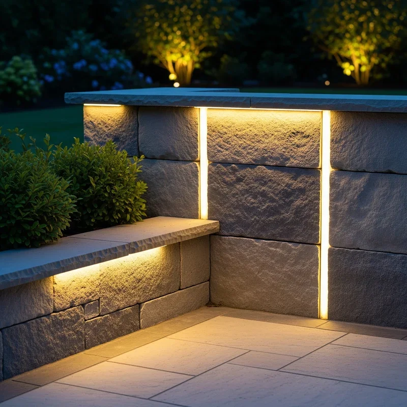 Transform your patio wall into a nighttime wonderland with strategic lighting that creates ambiance and extends outdoor living hours! Uplighting washes walls with soft glows that highlight textures and colors, while string lights add festive charm. Install LED strips behind translucent panels for modern backlighting effects, or use spotlights to highlight specific features. Smart lighting systems let you control colors and intensity from your phone, setting different moods for different occasions. Solar options reduce energy costs while providing eco-friendly illumination. Consider combining functional lighting with decorative fixtures like lanterns or sconces that double as wall art. The right lighting makes small spaces feel larger and creates intimate zones within bigger patios. Your wall becomes a chameleon that changes personality from day to night. Plus, good lighting enhances safety while making every evening feel like a special occasion!