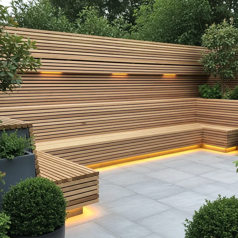Kill two birds with one stone by building privacy walls that incorporate built-in seating! These multi-functional structures define your patio boundaries while providing comfortable spots to relax. The wall height offers perfect back support while blocking unwanted views and wind. Add cushions and pillows for instant outdoor sofas that don't take up floor space. Storage compartments underneath seats hide cushions, garden tools, or outdoor games. You can build these from wood, concrete blocks, or stone, matching your overall patio design. The linear design creates clean sight lines and makes small patios feel more spacious. Include planters on top for added greenery or install hooks for hanging lights. Your wall becomes functional furniture that maximizes every square foot. This solution works brilliantly for narrow patios where traditional furniture would create cramped conditions.