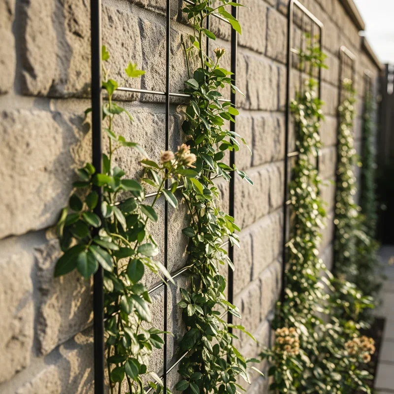 Let nature do the decorating with climbing plant trellises that turn your patio wall into a vertical jungle! These support structures guide vines and climbing plants upward, creating living wallpaper that changes throughout the seasons. Choose fast-growing options like clematis or jasmine for quick coverage, or go classic with climbing roses for romantic appeal. The trellis itself becomes part of the design, whether you opt for simple wire grids, elaborate wooden lattices, or modern metal frameworks. As plants mature, they provide natural shade, privacy, and even fruit if you choose grapes or passion fruit. The interplay between structured supports and organic growth creates visual tension that keeps things interesting. Maintenance involves occasional pruning and training, but the plants largely take care of themselves. Your wall evolves constantly, offering new blooms, colors, and textures throughout the year.