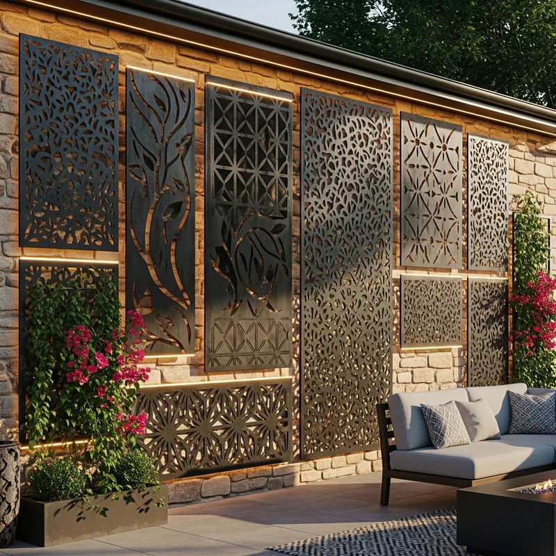 Add instant sophistication with decorative metal panels that combine art and function in stunning ways! These laser-cut or hand-forged screens create intricate patterns that cast beautiful shadows while providing privacy and wind protection. Choose from countless designs ranging from geometric patterns to nature-inspired motifs like leaves or birds. Corten steel develops a gorgeous rust patina over time, while powder-coated aluminum stays pristine with zero maintenance. You can backlight panels for dramatic nighttime effects or use them as climbing supports for vines. The see-through designs maintain airflow while defining spaces and adding architectural interest. Installation is surprisingly simple with the right mounting hardware. These panels work equally well as full walls or accent pieces combined with other materials. Your patio gains museum-quality art that happens to be functional too!
