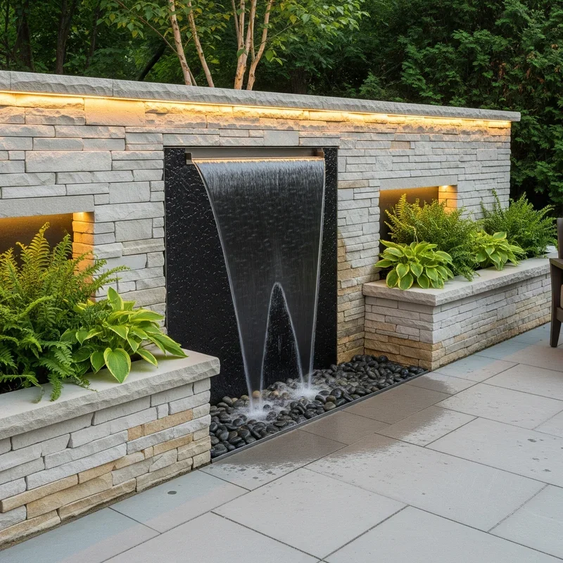 Transform your patio into a zen retreat with a water feature wall that soothes the senses and masks unwanted noise. These walls range from simple fountains to elaborate cascading waterfalls that create a resort-like atmosphere. The gentle sound of flowing water instantly relaxes everyone while providing natural white noise that enhances privacy. You can choose sleek, modern designs with sheet waterfalls or go natural with stacked stone and multiple tiers. LED lighting takes these features to another level at night, creating magical reflections and ambiance. The moving water also helps cool the surrounding air during hot summer days. Maintenance is easier than you'd think with proper filtration systems and occasional cleaning. Your patio becomes an oasis where stress melts away with every trickling droplet. It's like having your own personal spa right outside your door!