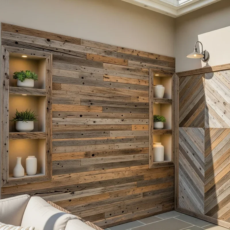 Bring warmth and character to your patio with reclaimed wood walls that tell a story with every weathered plank. Old barn wood, shipping pallets, or salvaged fence boards create instant rustic charm while being environmentally friendly. Each piece has unique grain patterns, nail holes, and patina that new wood simply can't replicate. The natural variation in color and texture adds depth without needing any additional decoration. You can arrange boards horizontally for a classic look, vertically for height, or in chevron patterns for modern flair. Sealed properly, reclaimed wood handles outdoor conditions beautifully while maintaining its aged appearance. This option pairs perfectly with industrial furniture or softens contemporary designs. Your patio gains instant history and authenticity that makes it feel like it's been there forever. Plus, you're giving old materials new life instead of sending them to landfills!