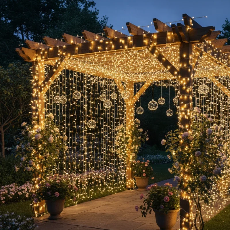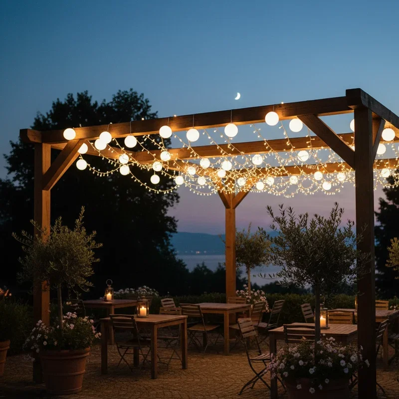 Globe lights, also called cafe lights, instantly transform your pergola into a European bistro or festive party venue. These round bulbs, typically ranging from ping-pong to tennis ball size, create bold points of light that feel both casual and celebratory. String them in straight lines for a clean, organized look, or let them drape naturally for relaxed charm. Shatterproof plastic globes stand up to weather and accidental impacts better than glass, making them perfect for family-friendly spaces. Available in classic white or rainbow colors, they set the tone for everything from birthday parties to quiet dinners. Their nostalgic appeal makes every gathering feel special.