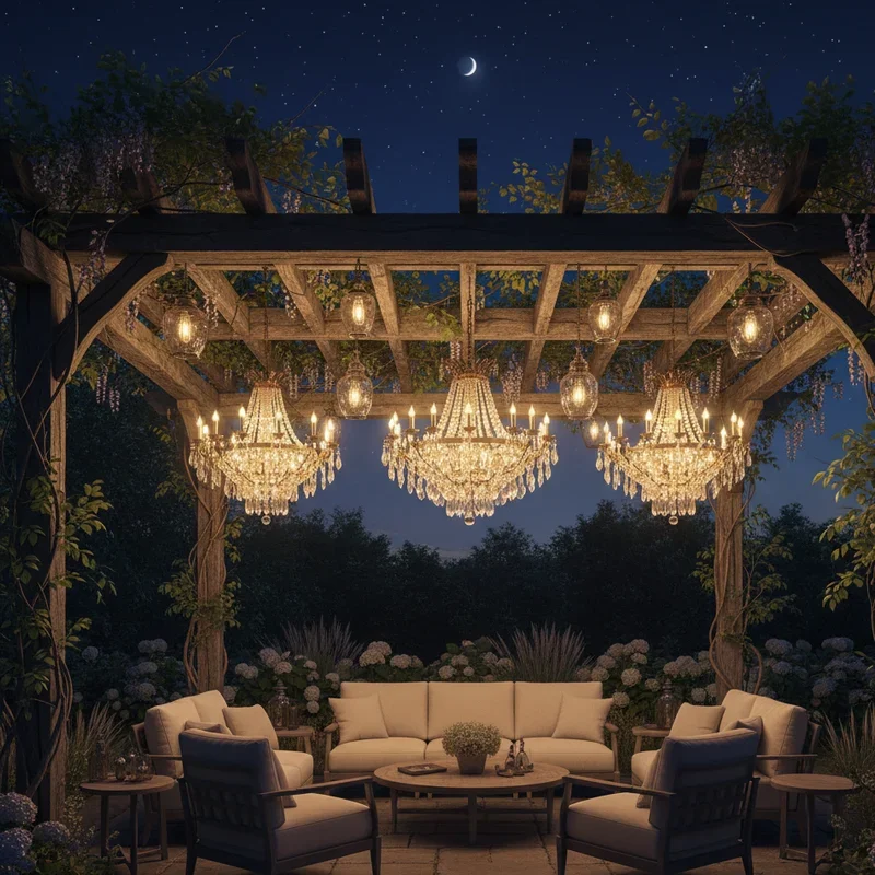 Who says chandeliers belong only indoors? Adding a chandelier to your pergola creates an unexpected focal point that elevates the entire space from simple shelter to elegant outdoor room. Weather-resistant options range from rustic wrought iron designs perfect for farmhouse aesthetics to crystal-adorned fixtures that sparkle in the evening breeze. Battery-powered or solar chandeliers eliminate the need for complex wiring while still delivering that wow factor. Position your chandelier centrally over a dining table or seating area where it can anchor the space and draw eyes upward. Even a simple candle chandelier creates drama, casting dancing shadows through the pergola's framework.