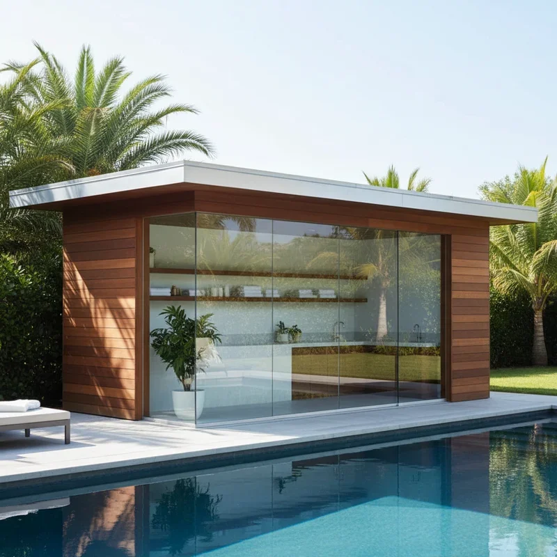 Make your pool shed a design feature rather than hiding it with this stunning glass-front approach! Floor-to-ceiling windows or glass garage doors showcase organized interiors while maintaining that open, airy feeling modern homeowners crave. The transparency creates visual continuity between pool and landscape, preventing the shed from feeling like an obstruction. Use frosted glass panels for chemical storage areas needing privacy while keeping decorative items visible. The natural light eliminates daytime electrical needs while making the space feel larger than its footprint. At night, interior lighting transforms the structure into a glowing lantern effect that enhances evening ambiance. Combine with steel framing and concrete floors for industrial elegance, or pair with wood accents for warmth. This bold choice requires maintaining organization since everything's on display, but that accountability keeps spaces perpetually neat.