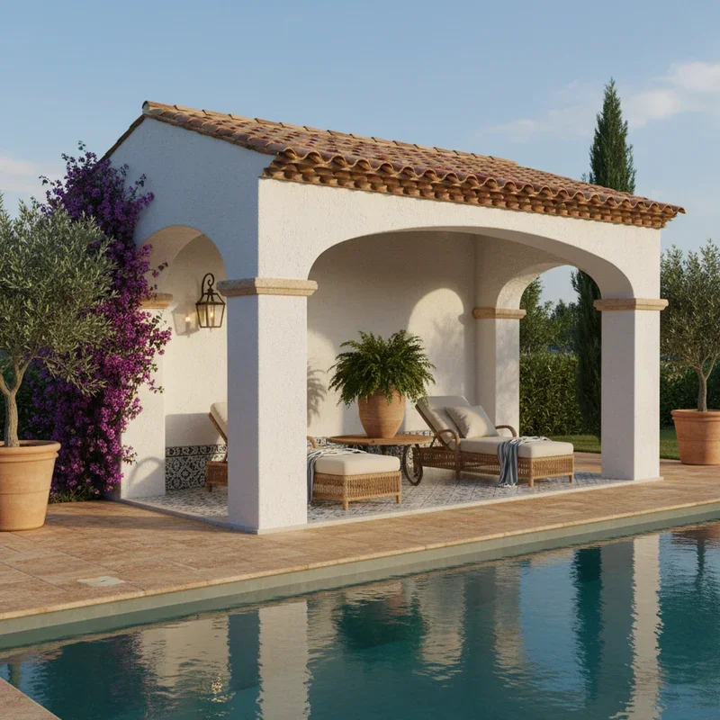 Transport yourself to the Italian Riviera with a Mediterranean-style pool cabana that combines old-world charm with modern functionality! Stucco walls in warm terracotta or soft yellow create that sun-baked appearance, while clay tile roofing adds authentic character. Arched doorways and windows soften the structure's lines, creating romantic appeal that enhances any pool area. Inside, built-in benches with hidden storage compartments provide seating and organization simultaneously. Wrought iron details on handles, hinges, and decorative elements complete the European aesthetic. Install wooden shutters that actually close for security while adding decorative appeal when open. The covered porch area offers shade for lounging while keeping pool supplies accessible but hidden. Add potted olive trees, lavender plants, and climbing bougainvillea to complete the Mediterranean paradise. This style particularly suits homes with Spanish or Italian architectural influences.