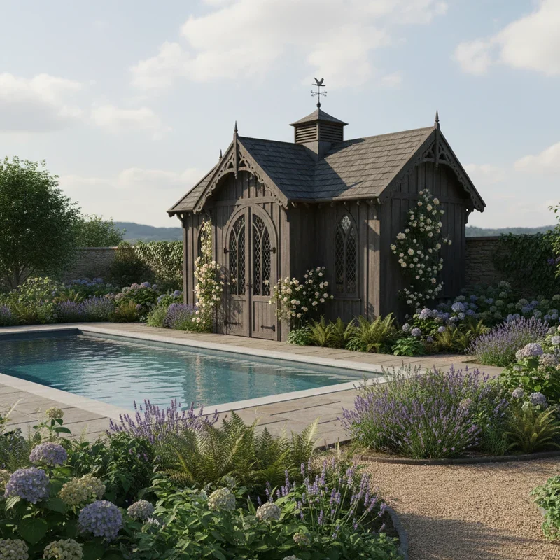 Add vintage elegance with a Victorian-inspired pool house featuring ornate details and romantic charm! Decorative trim work, scalloped shingles, and gingerbread details create visual interest that elevates basic storage to artistic statement. Paint in period-appropriate colors like sage green with cream trim or dusty blue with white accents. Multi-pane windows with decorative shutters maintain historical accuracy while providing natural light. Inside, beadboard walls and vintage-style hardware continue the theme without sacrificing modern functionality. A covered porch with decorative brackets offers shaded seating while maintaining the Victorian aesthetic. Climbing roses or clematis on trellises soften the structure's edges. This style particularly complements older homes or gardens with established landscaping. The ornate details distract from utilitarian purposes, making storage feel like a delightful garden folly. Every trip for pool supplies becomes a journey to a more genteel era.