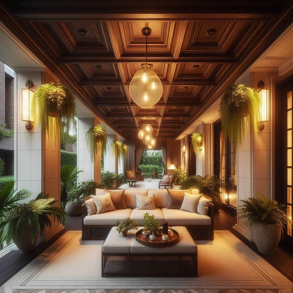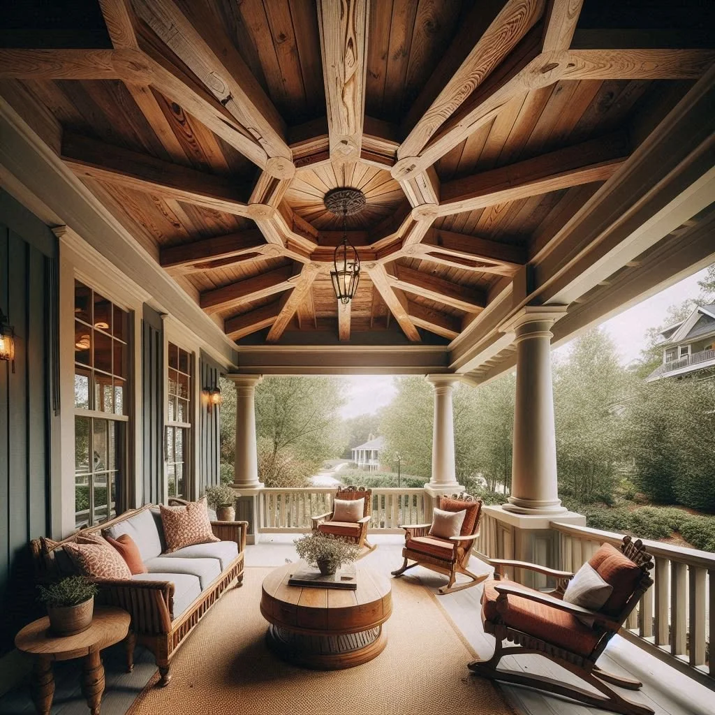 If you're looking to add architectural interest to your porch, coffered ceilings are an elegant and functional choice. These intricate ceilings create depth and dimension, transforming the space into something truly special. Even small porches can feel more expansive with the addition of coffered details, as the grid pattern draws the eye upward and enhances the overall aesthetic. To make the most of this design, consider using contrasting paint or stain colors to highlight the pattern, such as a dark wood stain for the beams against a lighter ceiling color or vice versa. This contrast adds drama and sophistication, making your porch feel like an extension of your home’s architectural style while maintaining a cozy, inviting atmosphere.
