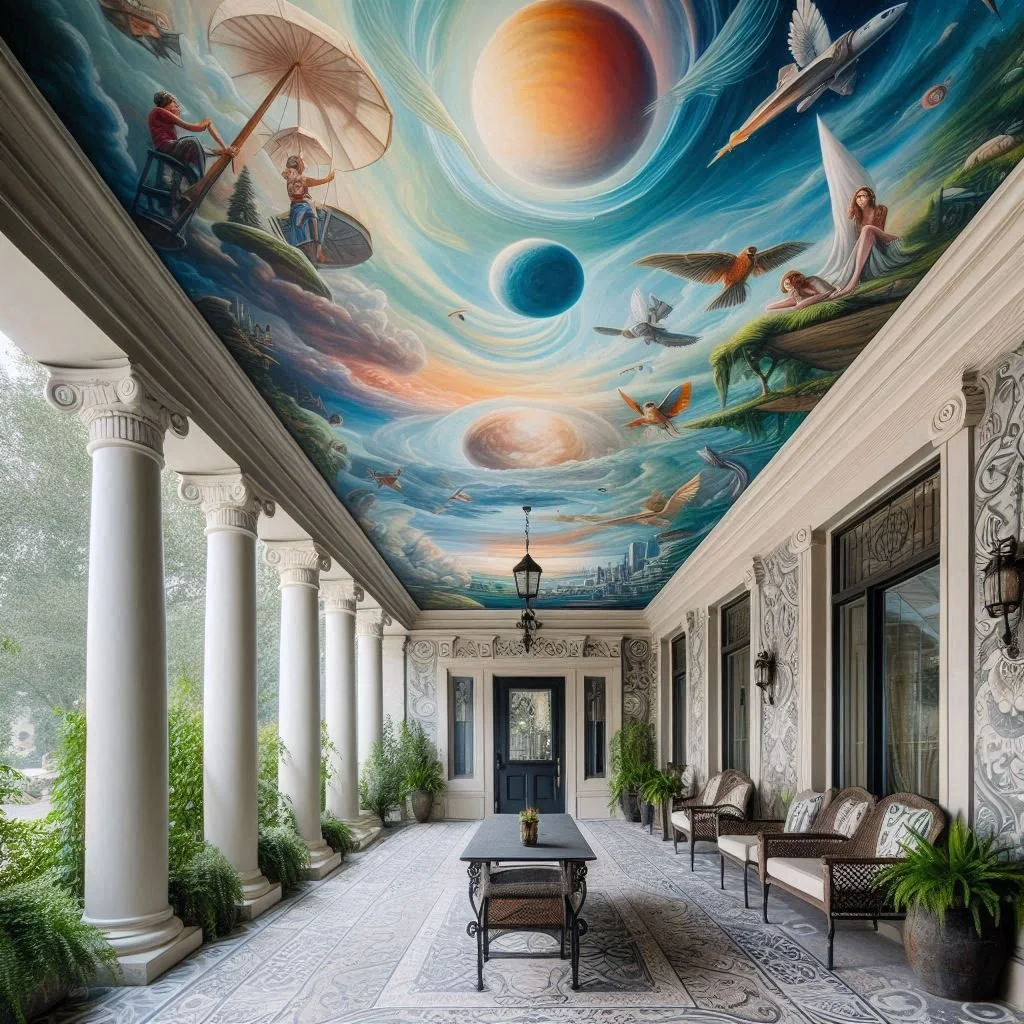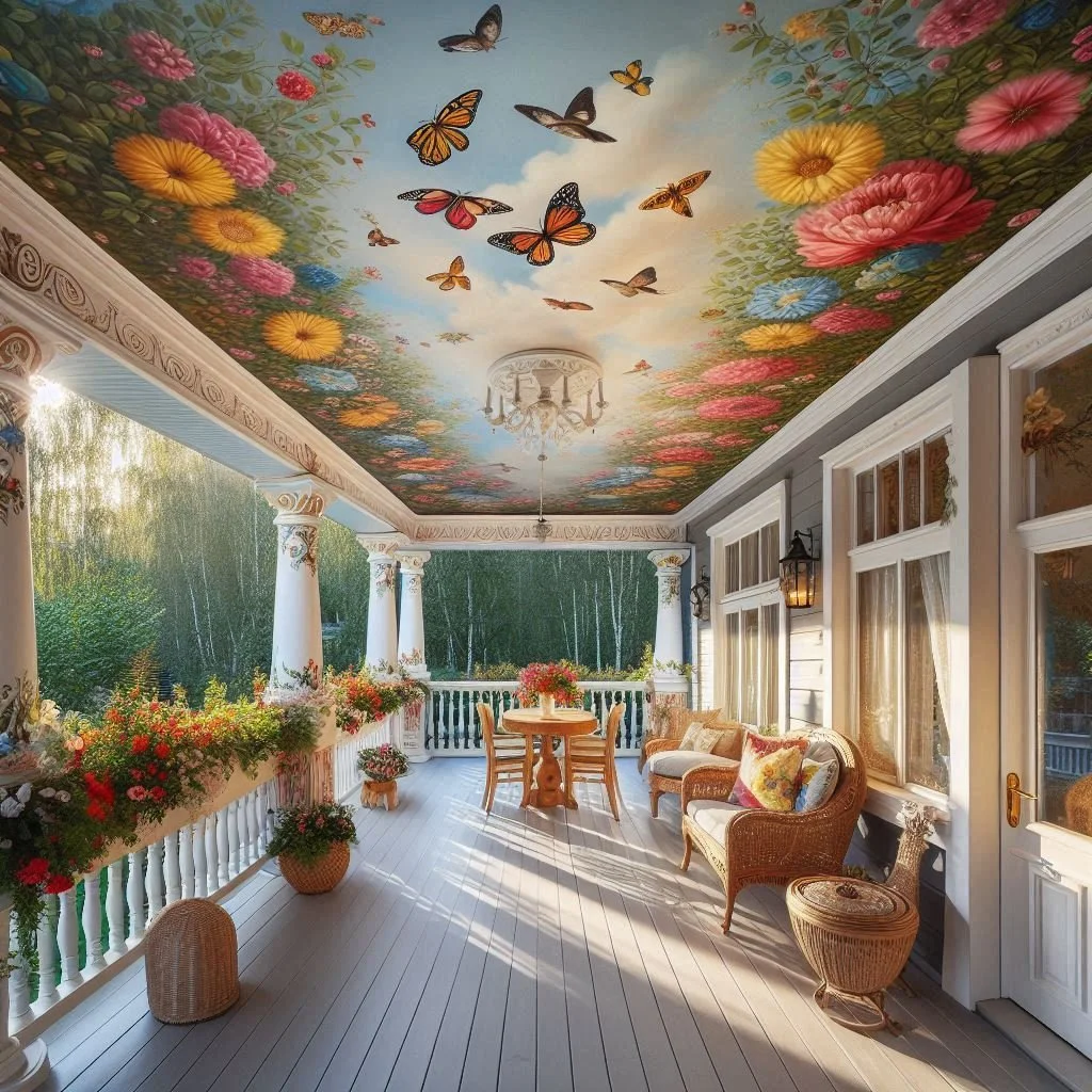 Why not turn your porch ceiling into a canvas for creativity? Murals and outdoor art bring a unique flair to the space and can truly elevate your design. Whether you opt for a celestial theme, abstract patterns, or a nature-inspired scene, a painted or illustrated ceiling becomes a striking focal point that draws the eye upward. This artistic approach not only adds personality but also serves as a conversation starter, making your porch stand out from the typical outdoor space. Depending on your style, you can go bold with vibrant colors or keep it subtle with softer tones that blend seamlessly into your overall décor. With the right touch, your ceiling can become a work of art that enhances the atmosphere of your porch and makes it feel truly one-of-a-kind.