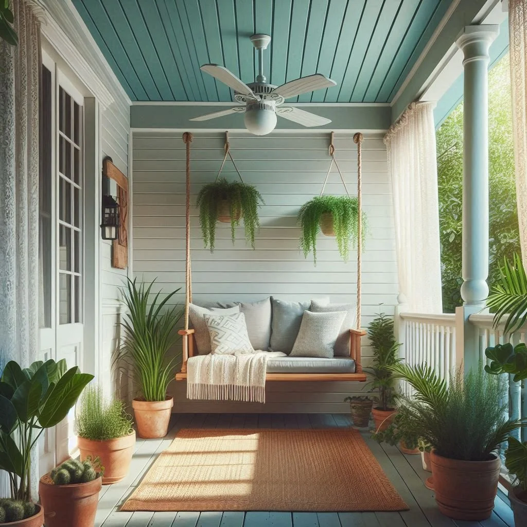 Functionality meets style when you incorporate ceiling fans with integrated lighting into your porch design. A ceiling fan is perfect for keeping the space cool during warmer months, while the integrated lighting provides much-needed illumination, whether for evening gatherings or relaxed nights under the stars. The key to a polished look is to match the fan and light fixtures to your ceiling design, ensuring a cohesive aesthetic. For example, a sleek, modern ceiling fan pairs well with minimalist or contemporary ceilings, while a more rustic, vintage fan complements wood-paneled or traditional designs. Whether you’re looking for a statement piece or a more subtle fixture, combining these two elements enhances both the practicality and beauty of your porch space, making it comfortable and stylish year-round.