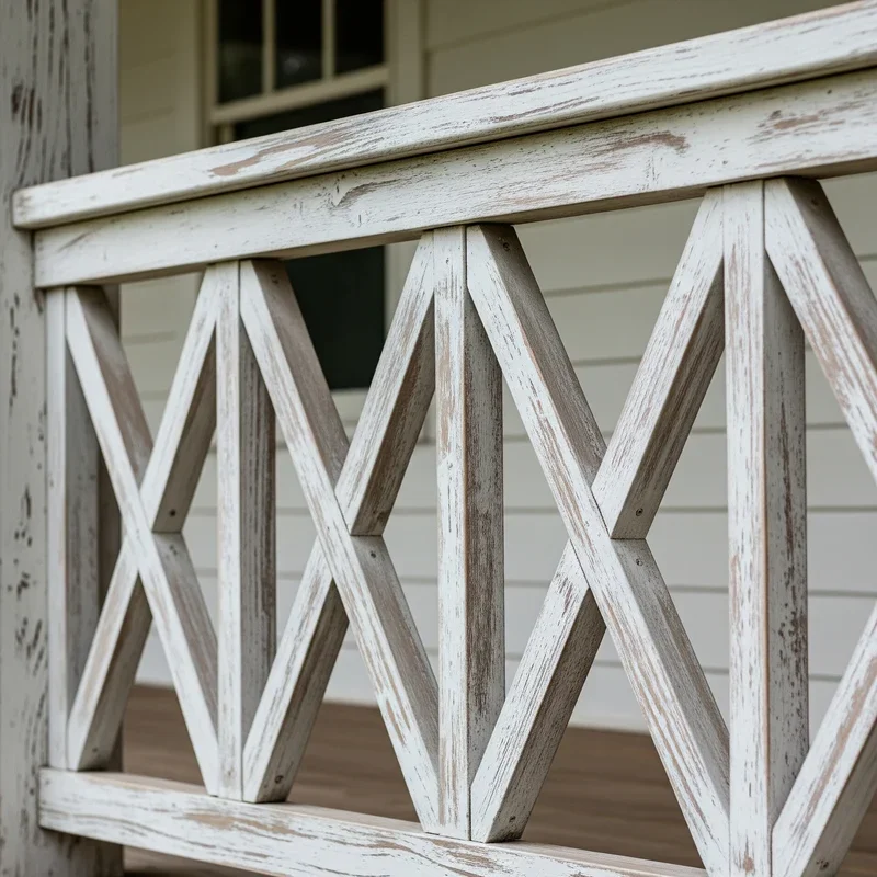 Channel your inner Joanna Gaines with farmhouse X-pattern railings that bring rustic charm and country appeal to any porch. These distinctive railings feature crossed diagonal supports that create eye-catching geometric patterns reminiscent of barn doors and rural fencing. They're basically the plaid shirts of porch railings! The X-pattern provides excellent structural support while adding visual interest that draws the eye. White-painted wood remains the classic choice, but natural stains or two-tone designs create equally appealing variations. This style works beautifully with board-and-batten siding, metal roofs, and cottage gardens. The design's simplicity makes it suitable for DIY installation, perfect for handy homeowners. Farmhouse railings instantly create that cozy, welcoming atmosphere that makes people want to sit on your porch with sweet tea and good conversation.