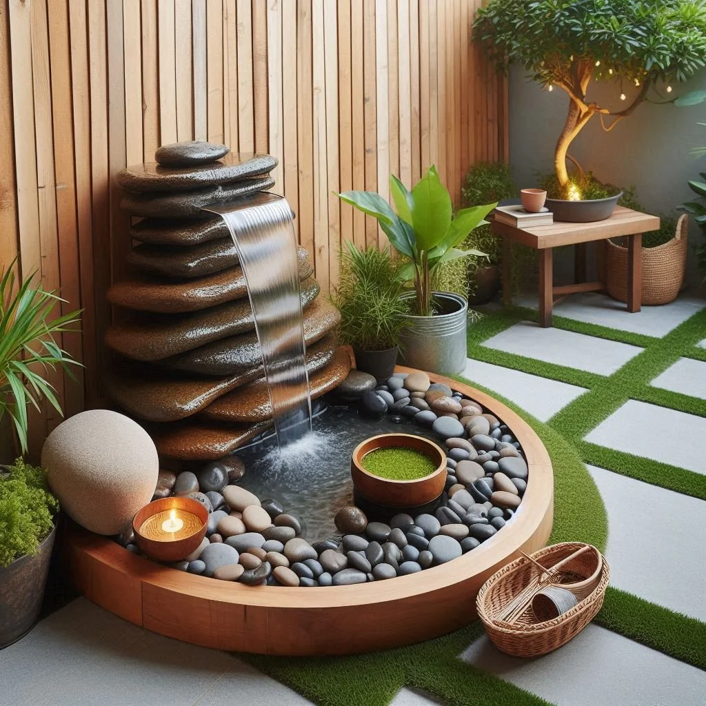 Bring tranquility to your backyard with a small water feature, perfect for creating a serene atmosphere. Whether it’s a bubbling fountain, a trickling waterfall, or a miniature pond, the soothing sounds of flowing water add a calming element to your outdoor space. Place your water feature near seating areas or along pathways to enhance relaxation, making it a focal point of your garden. You can surround it with lush greenery, ornamental grasses, or colorful flowers to integrate it seamlessly into your landscape. If you opt for a pond, consider adding water lilies or goldfish to boost the charm. A water feature not only promotes peace but also attracts birds and pollinators, making your yard feel alive and connected to nature.