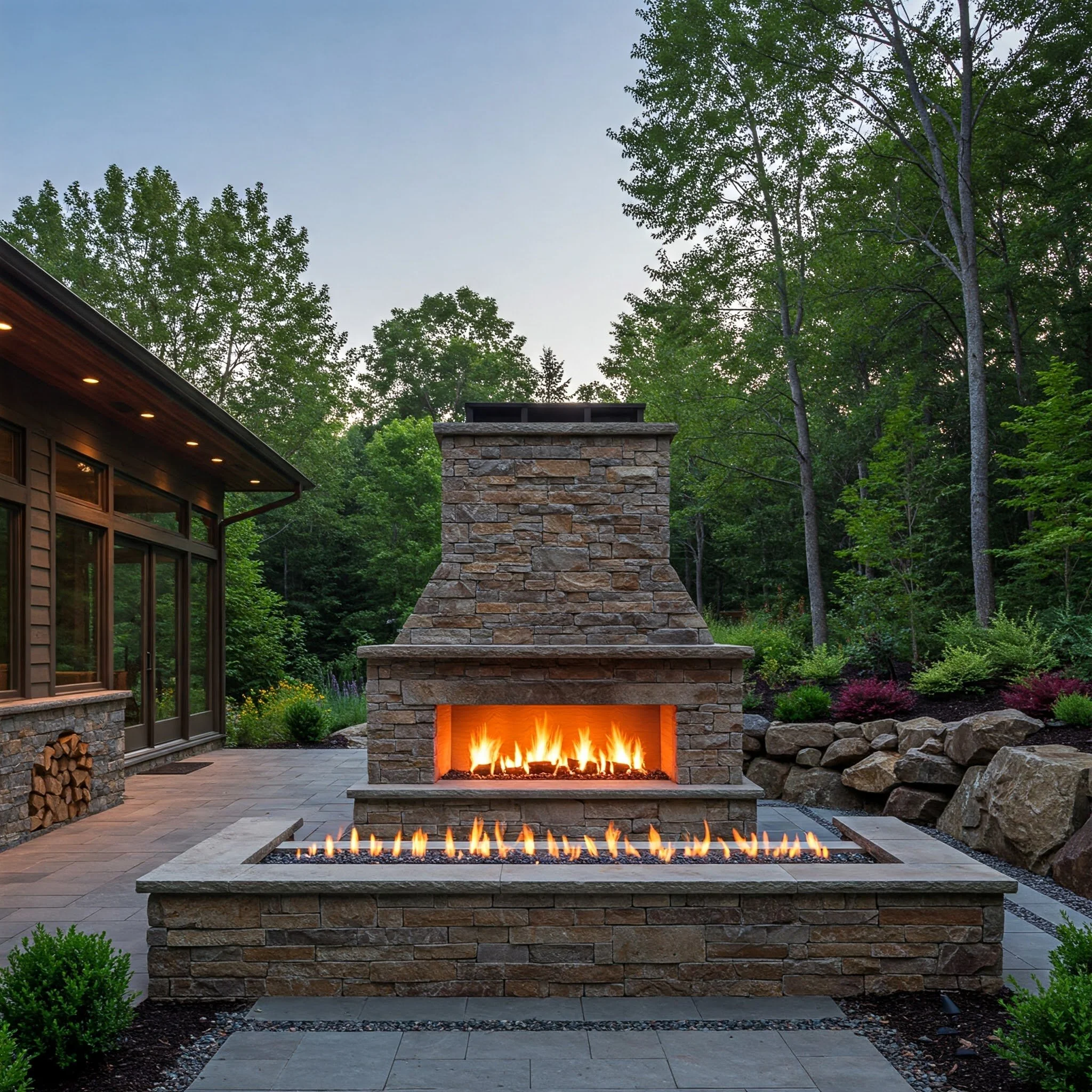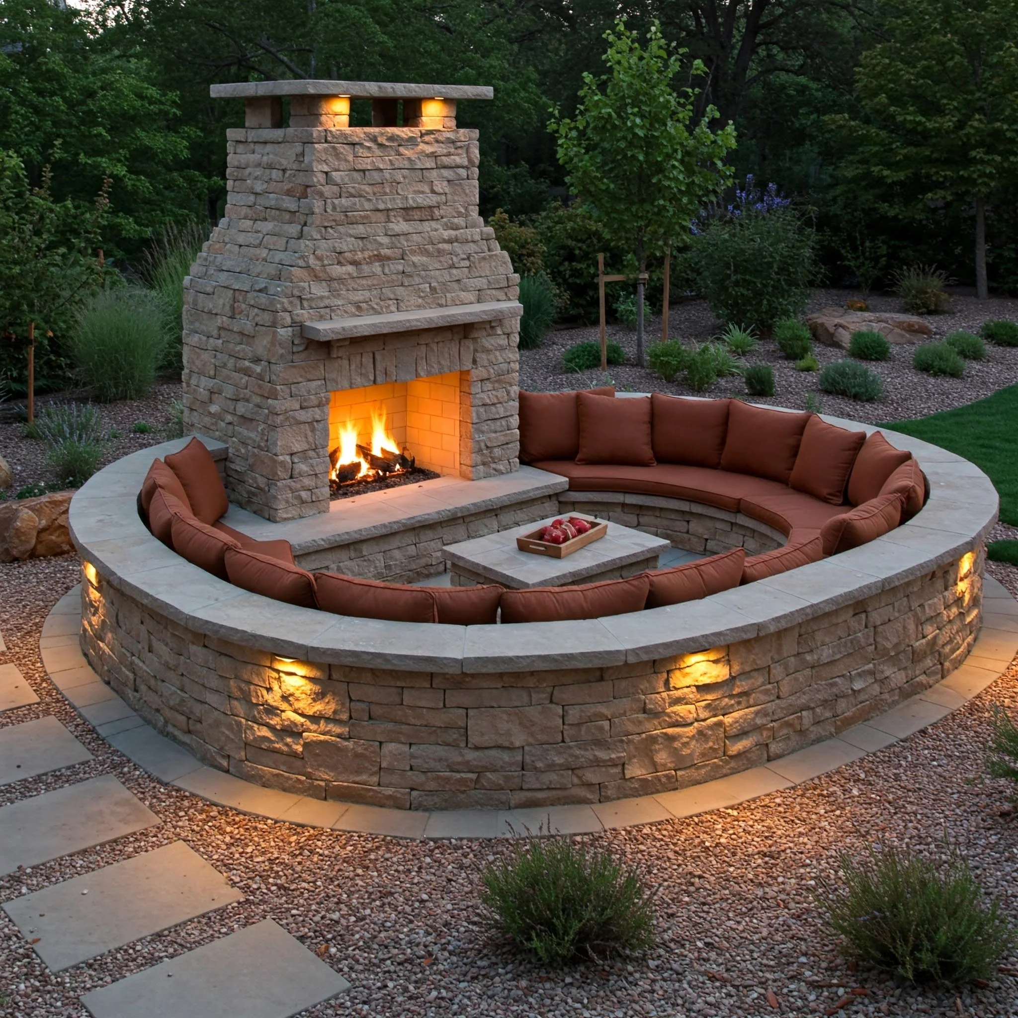 Step into a design where your stone fireplace seems to stretch into the horizon, seamlessly blending with the surrounding landscape in a style known as infinity stone fireplaces. This innovative approach eliminates hard edges, creating a soft transition between the structure and nature. Every stone is laid with precision to form curves and gradients that merge with your garden’s contours, giving the illusion that the fireplace is part of the natural terrain. The effect is mesmerizing, as if your outdoor space has been touched by the magic of nature itself. The warm glow of the fire complements the gentle backdrop of trees and hills, inviting you to lose yourself in the enchanting interplay of light and shadow. This design not only elevates the aesthetic appeal of your backyard but also creates a serene atmosphere that encourages relaxation and reflection, making every evening feel like a quiet escape into nature.
