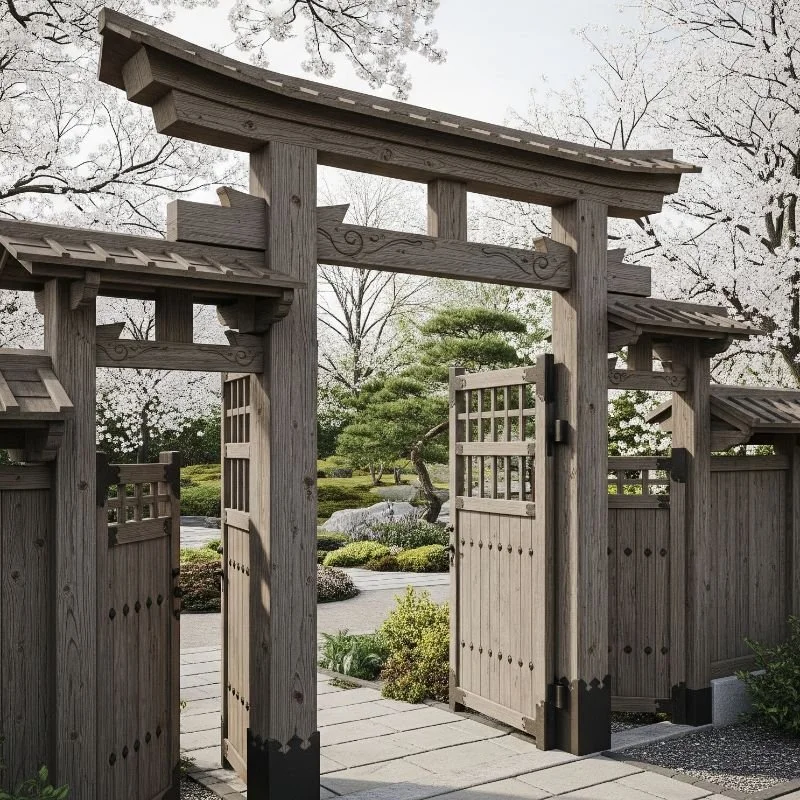 Create a transportive entrance experience with Japanese Torii-inspired wooden gates that bring Zen-like tranquility to your property's first impression. These distinctive designs feature two vertical posts supporting one or two horizontal crossbeams with gracefully curved ends—an architectural motif that traditionally marks the transition from mundane to sacred space. Construct your interpretation using Western red cedar or redwood stained in traditional vermilion or subdued natural tones that weather beautifully with age. Unlike fully enclosed gates, these open-topped structures frame the view beyond while creating a definitive threshold moment. Position these gates at the entrance to meditation gardens, woodland pathways, or as distinctive driveway markers where their unique silhouettes create impressive focal points. This architectural statement particularly complements Asian-inspired landscaping, minimalist modern homes, or properties featuring Japanese maples, cloud-pruned shrubs, or bamboo plantings. Like a perfectly placed sculptural element, these gates transform ordinary entrances into memorable landscape moments that reset visitors' expectations upon arrival.
