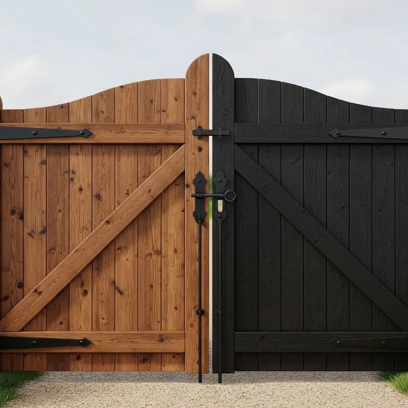 Elevate ordinary gate designs through sophisticated two-tone finishing techniques that create visual distinction while highlighting architectural details. This contemporary approach combines contrasting colors or treatments—pairing natural wood with painted elements, contrasting light and dark stains, or combining weathered and polished surfaces within single cohesive designs. Implement by identifying structural components like frames, panels, or decorative elements that can receive different treatments while maintaining design cohesion. For subtle sophistication, consider monochromatic pairings with slight variation, while dramatic statements might incorporate bold color contrasts that highlight specific features. This approach transforms standard gate styles into custom-appearing creations while enabling coordinated connections with other property elements through thoughtful color relationships. The contrasting elements naturally draw visual attention, making these gates particularly effective for properties where directing visitor focus toward the entrance enhances overall arrival experience. Like fashion's classic pairing of contrasting colors that create visual interest through juxtaposition, these gates utilize simple finishing techniques to transform standard designs into distinctive property statements that appear more expensive than their actual cost.
